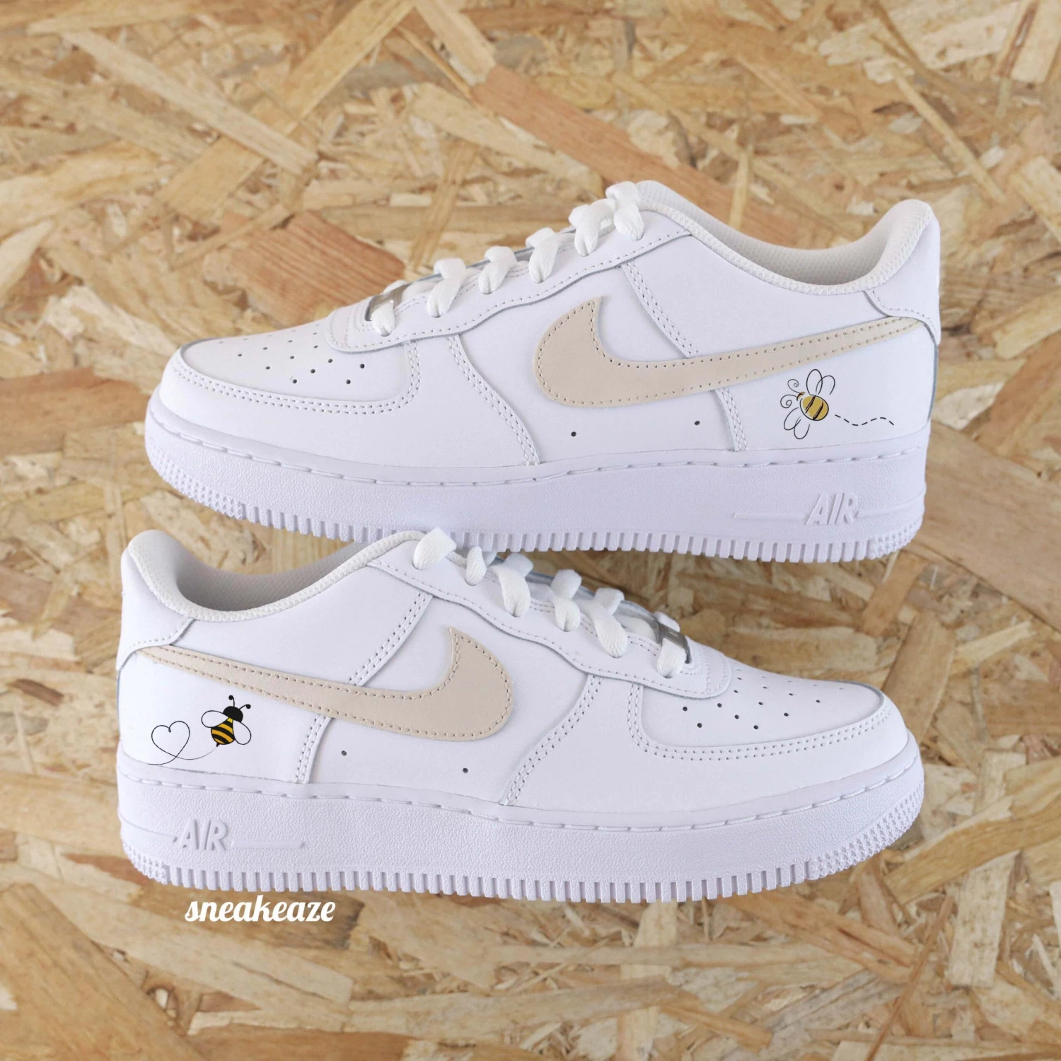 Baskets Nike Air Force 1 custom beige pastel et dessins abeille sur les côtés extérieurs.