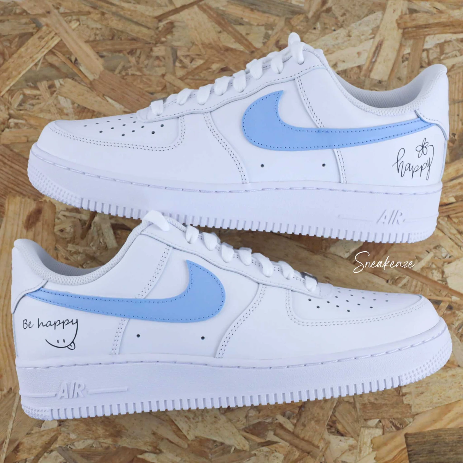 Baskets Nike Air Force 1 custom baby blue et inscription ” Happy” sur les côtés extérieurs.