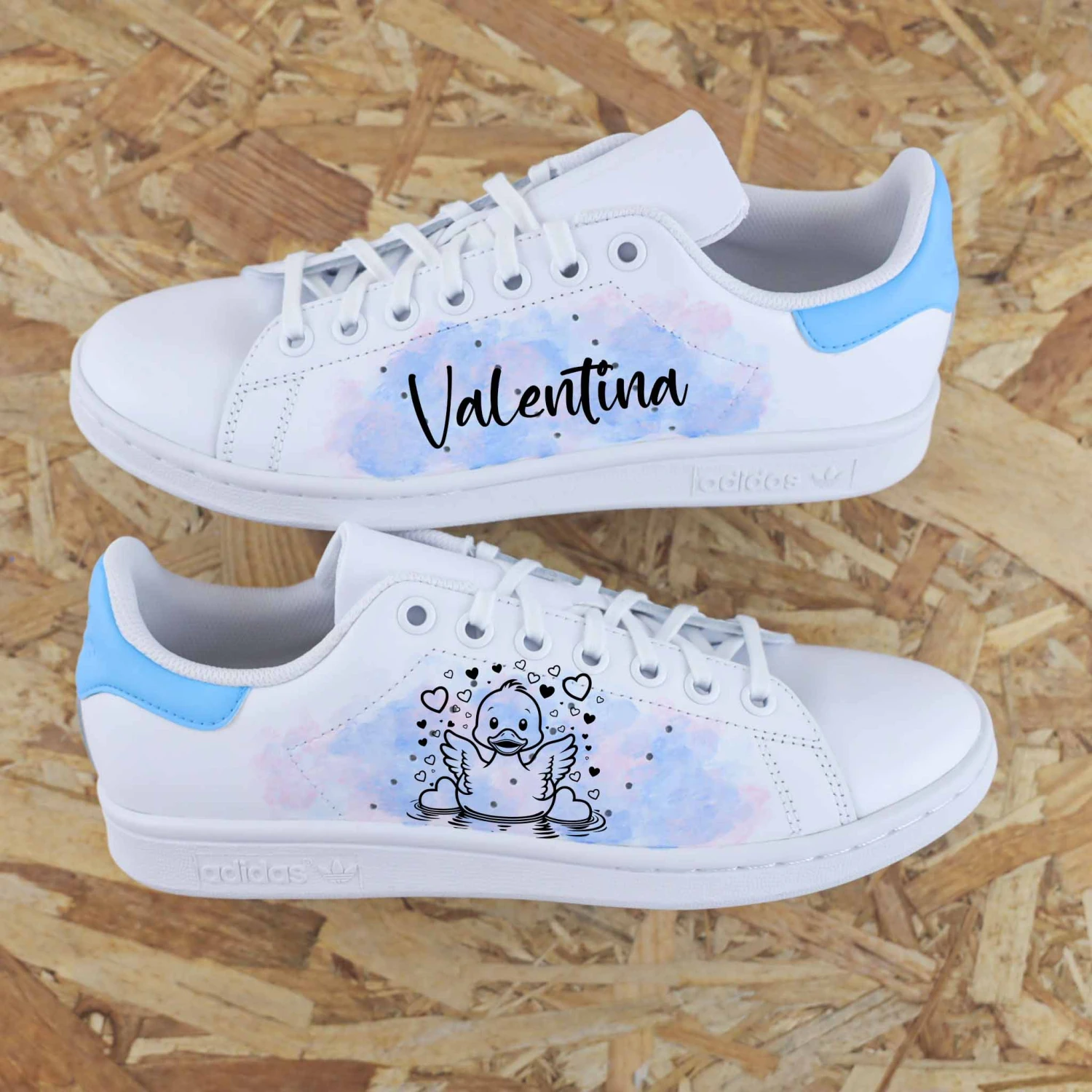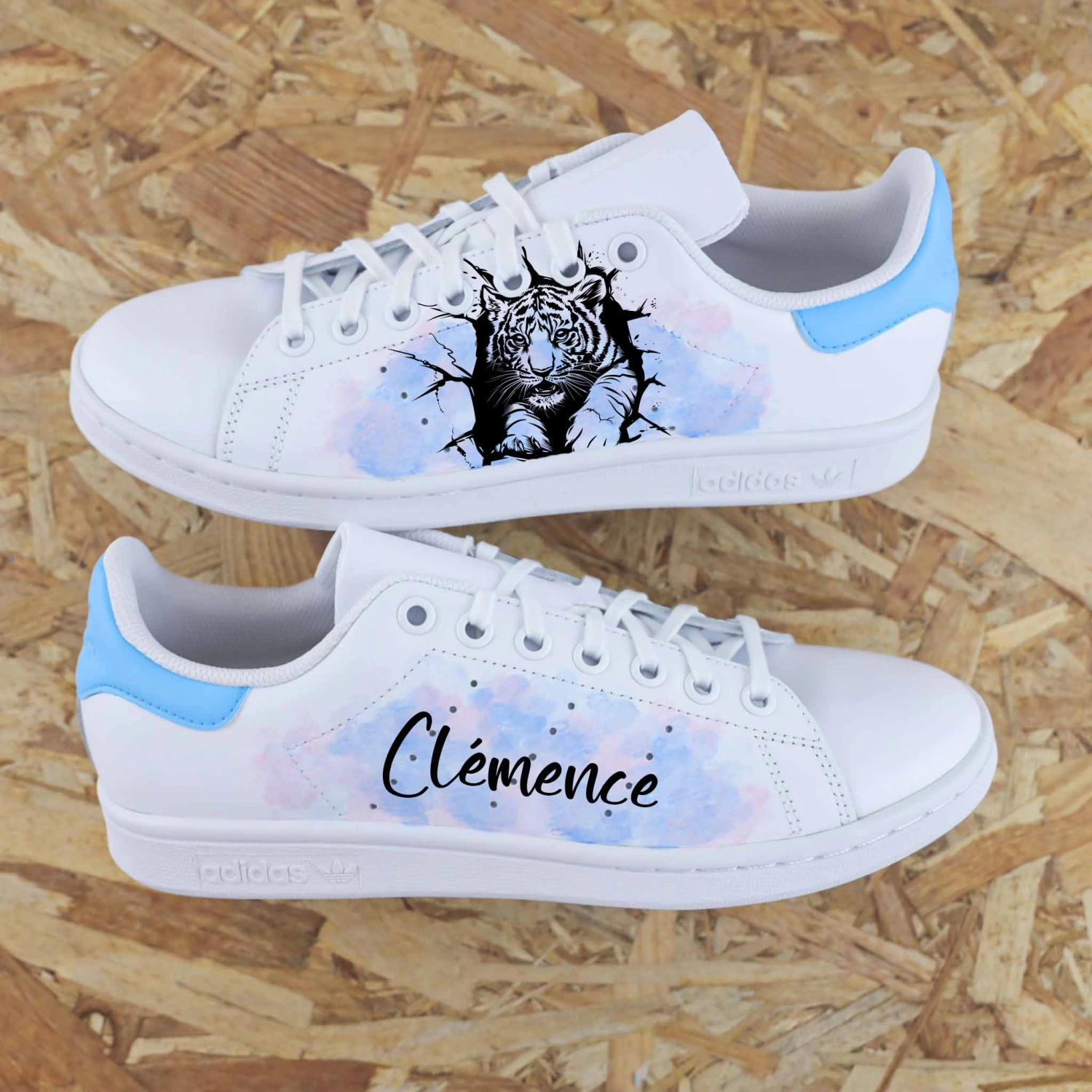 Baskets Adidas Stan Smith custom dessin, inscription prénom et effet aquarelle bleu