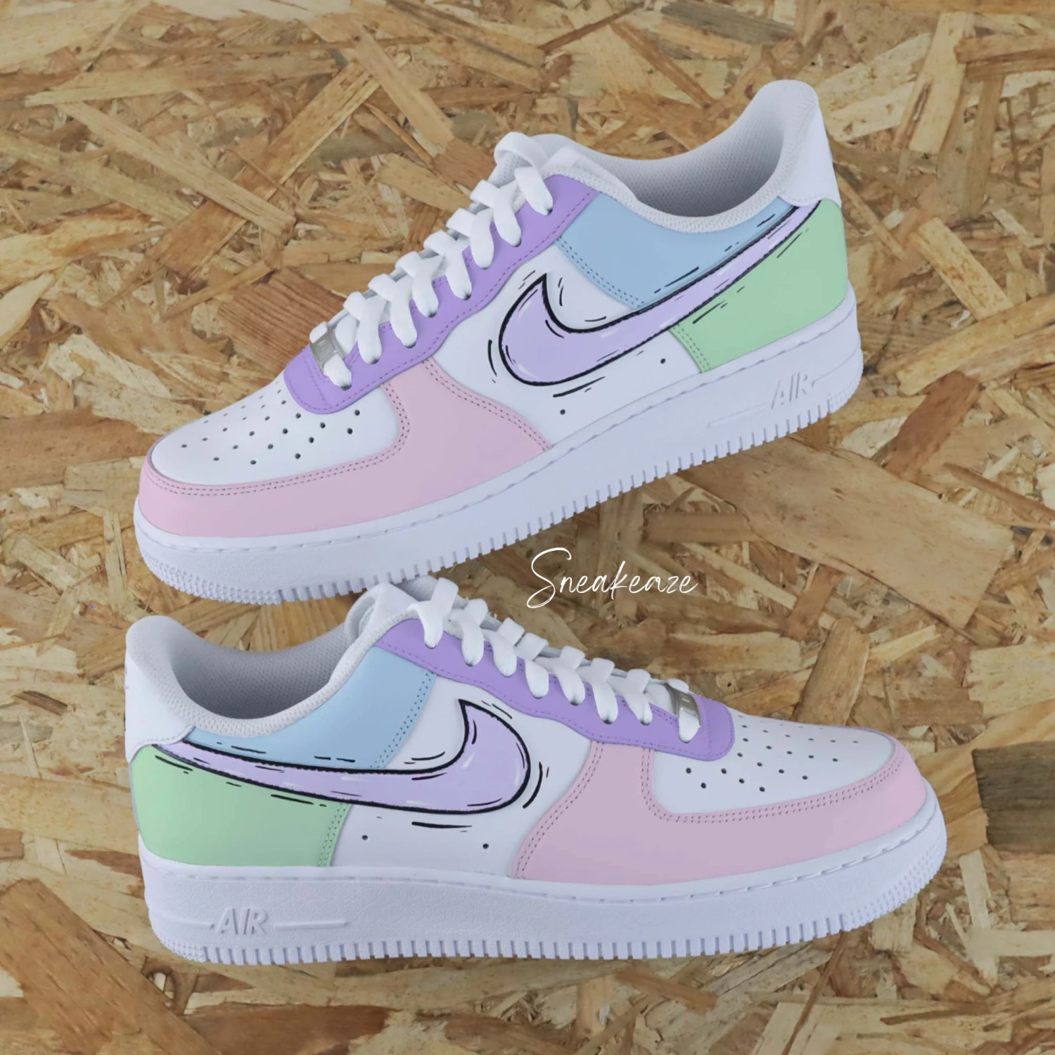 Baskets Nike Air Force 1 custom effet cartoon sketch multicolor pastel.