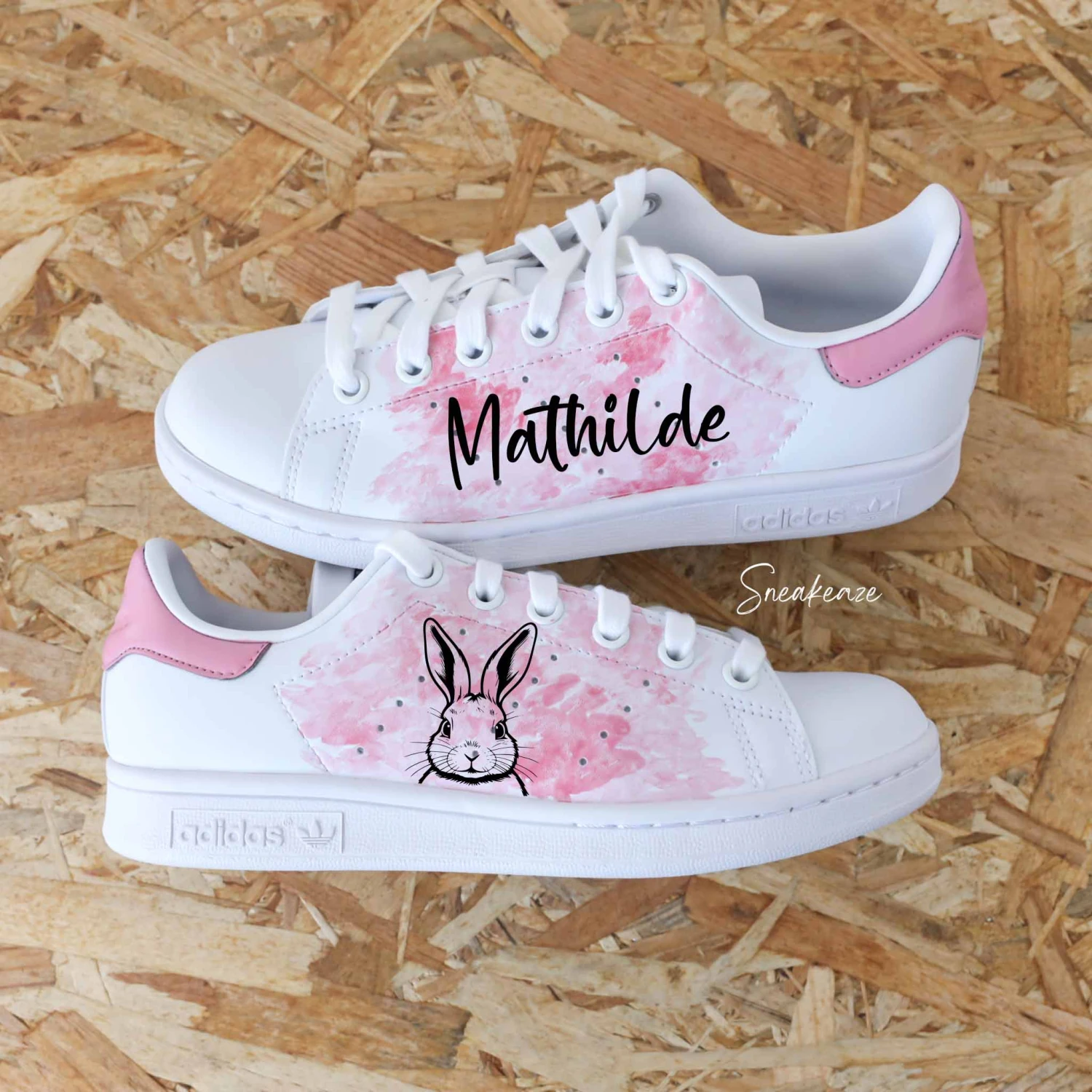 Baskets Adidas Stan Smith custom dessin, inscription prénom et effet aquarelle rose