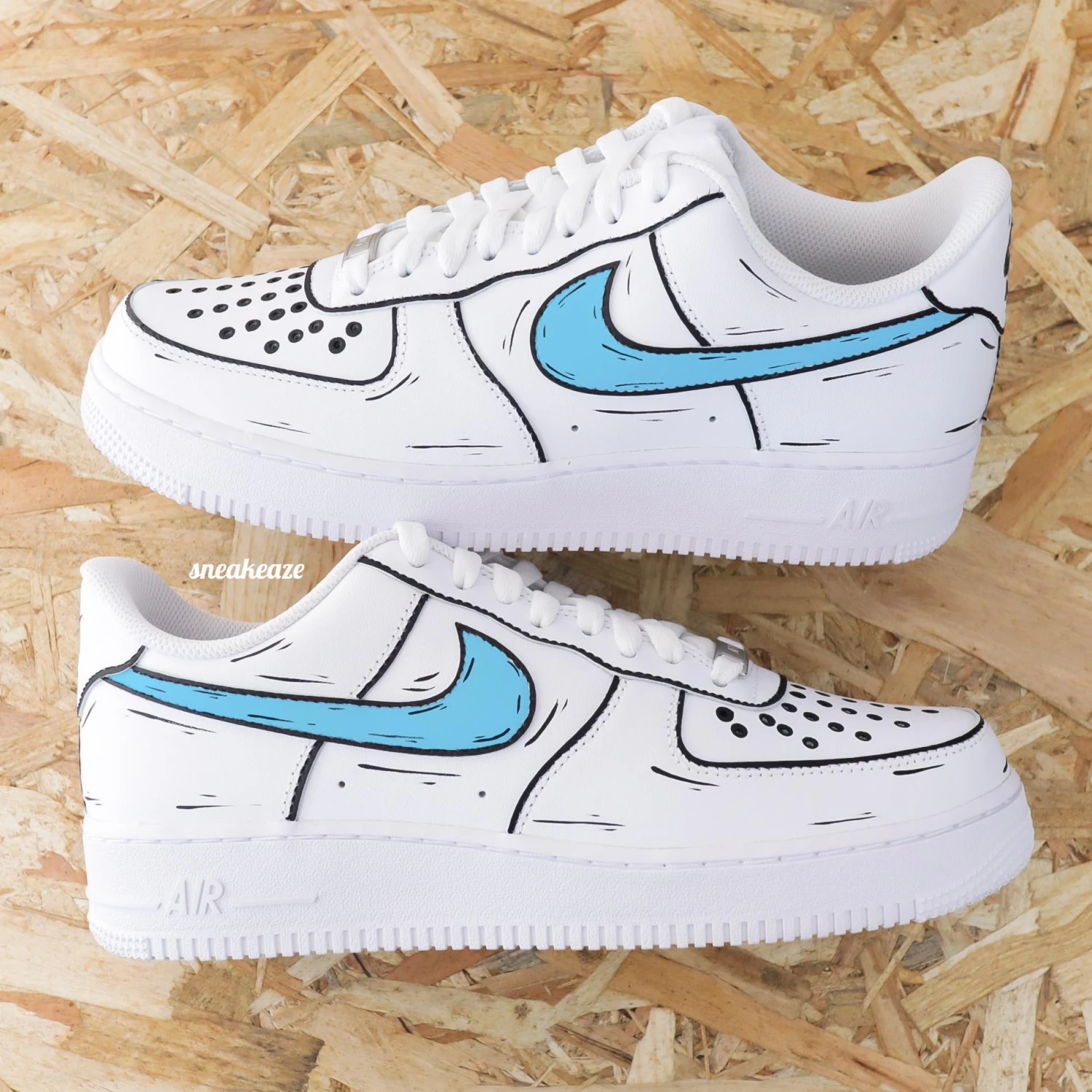 Baskets Nike Air Force 1 custom classic sketch style cartoon signes Nike de couleur bleu. Je souhaite ajouter un prénom à mon custom