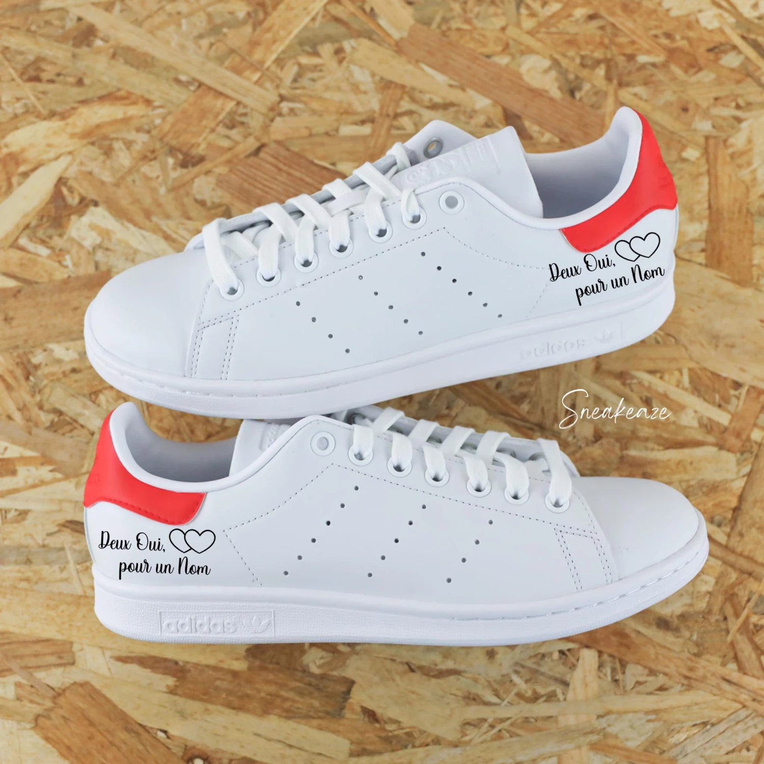 Basket Adidas Stan smith custom talon peint à la main + inscription “Deux oui pour un Nom” sur les côtés extérieurs.