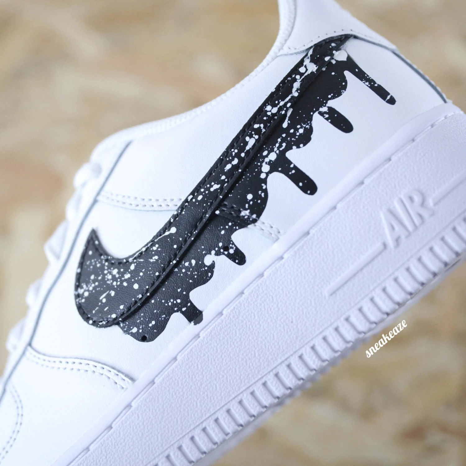 Baskets Nike Air force 1 custom modèle drip effet coulant noir avec splash blanc. Motifs sur côtés extérieurs. Swoosh intérieur assorti. Je souhaite ajouter un prénom à mon custom