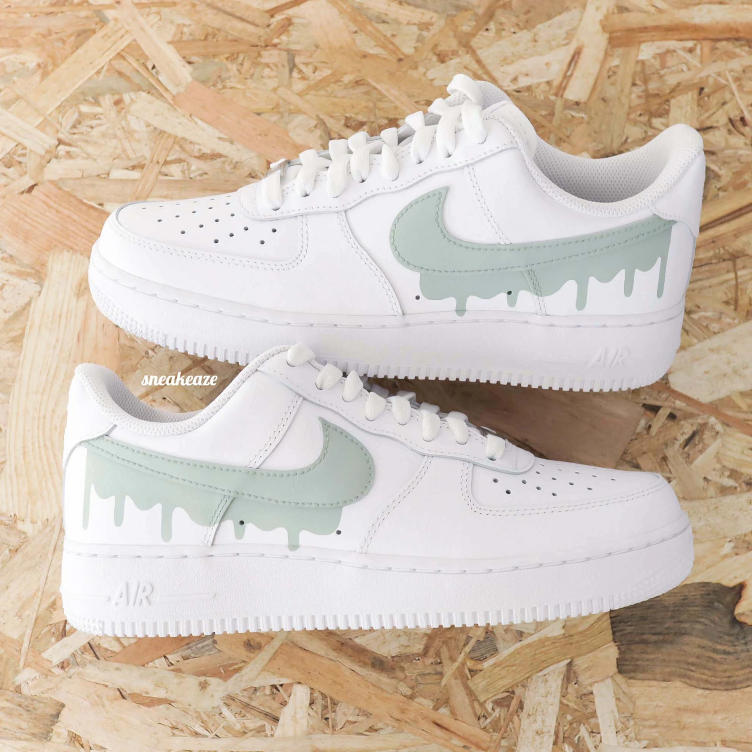 Baskets Nike Air force 1 custom modèle drip vert de gris. Motifs sur côtés extérieurs.