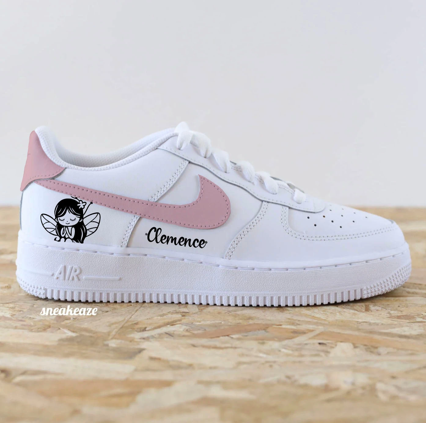 Baskets Nike Air Force 1 custom modèle swoosh rose clair (les 4 côtés sont peints) et talon + inscription d’un prénom et dessin d’une fée sur les côtés extérieurs.