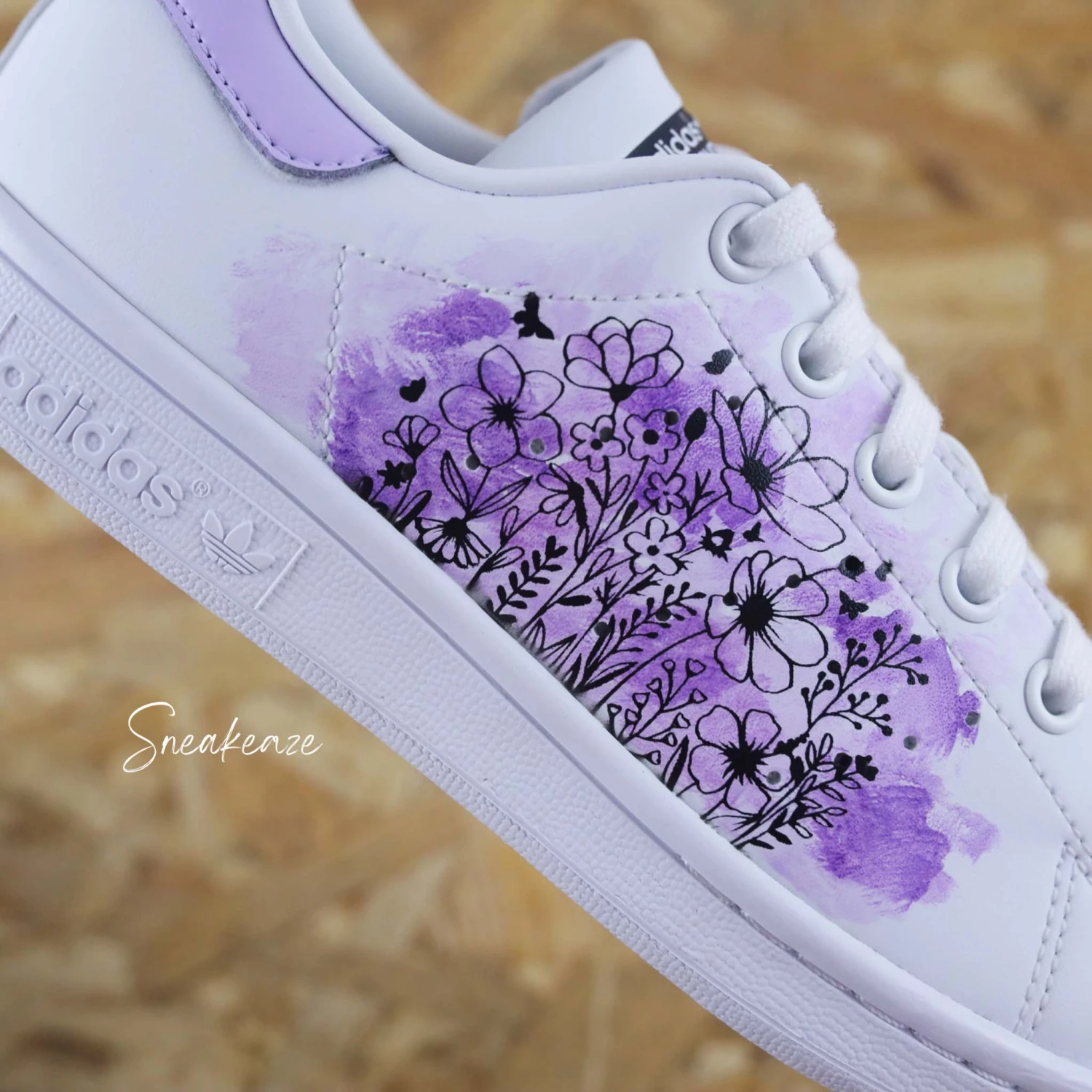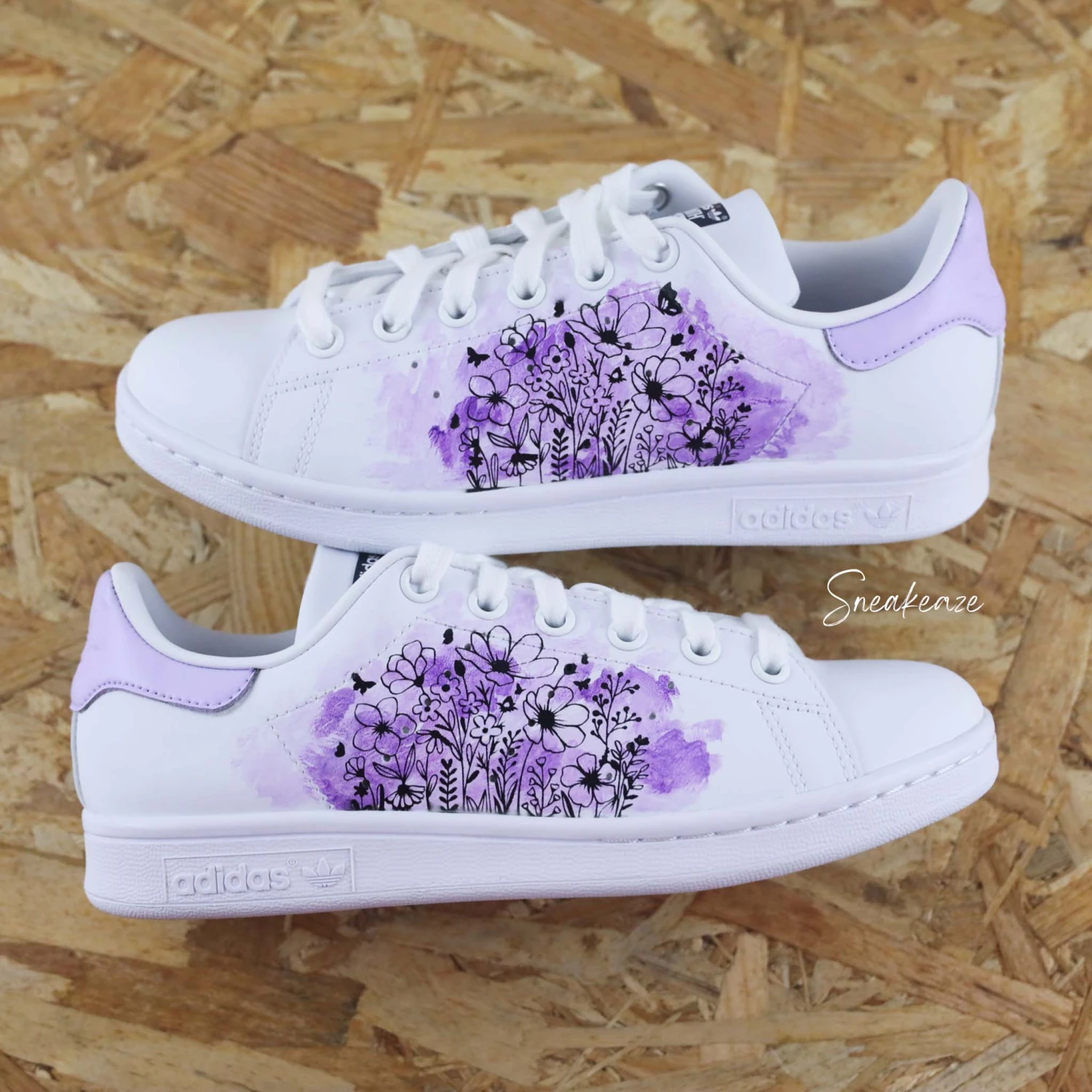 Baskets Adidas Stan Smith custom dessin fleurs champêtres et effet aquarelle