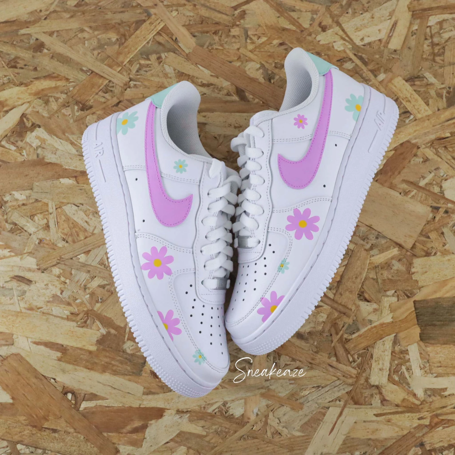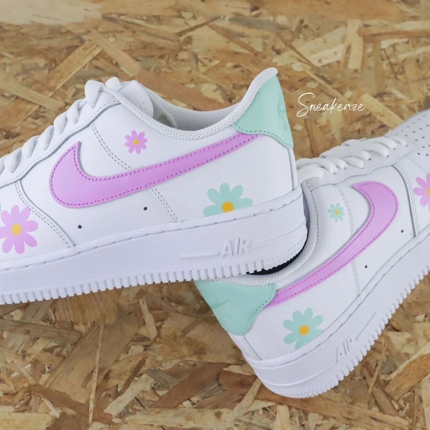 Baskets Nike Air Force 1 custom couleur baby pink et vert d’eau avec dessins de fleurs marguerites.