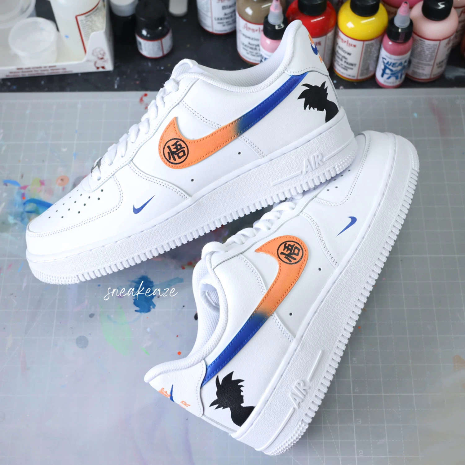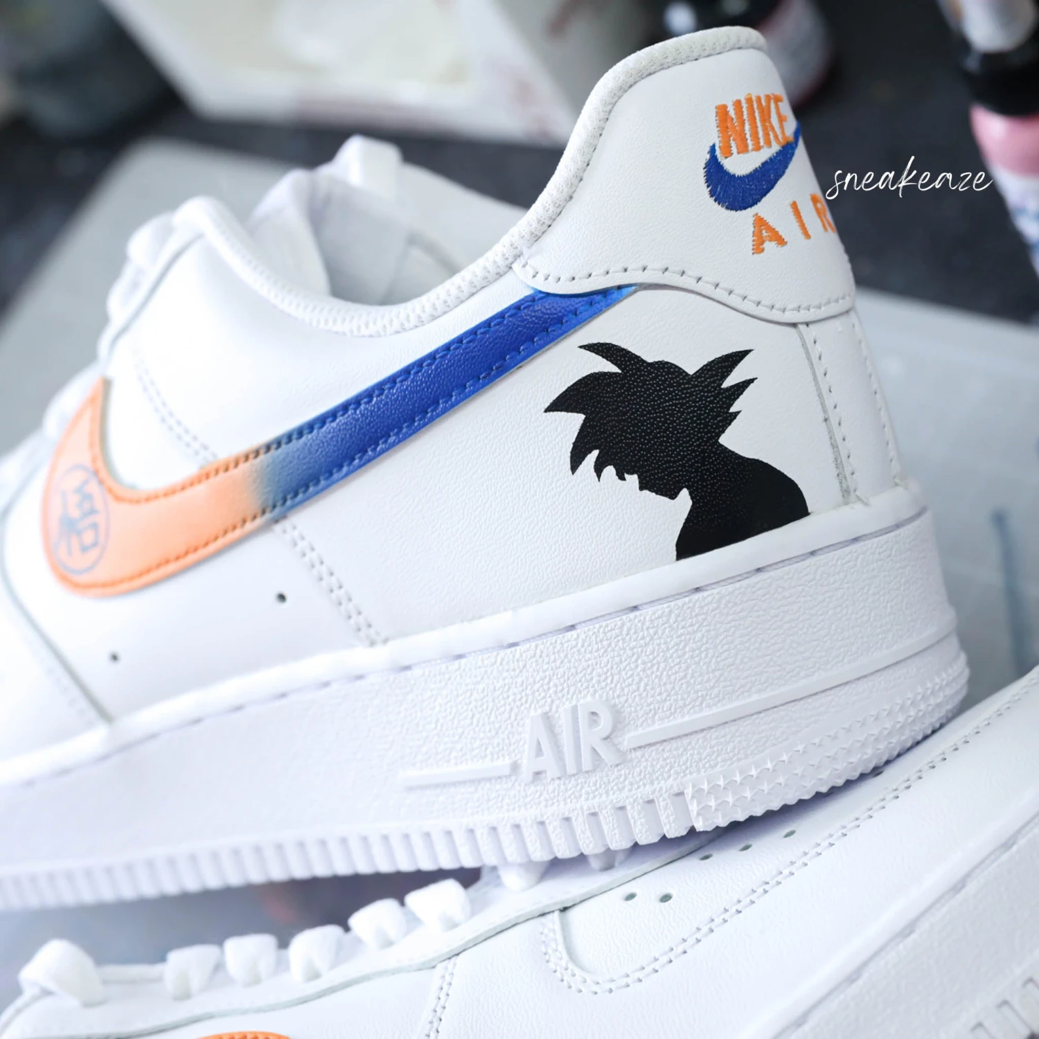 Baskets Nike Air force 1 custom motifs Dragon Ball Z sur côtés extérieurs. Signes Nike peints en dégradé orange et bleu. Je souhaite ajouter un prénom à mon custom