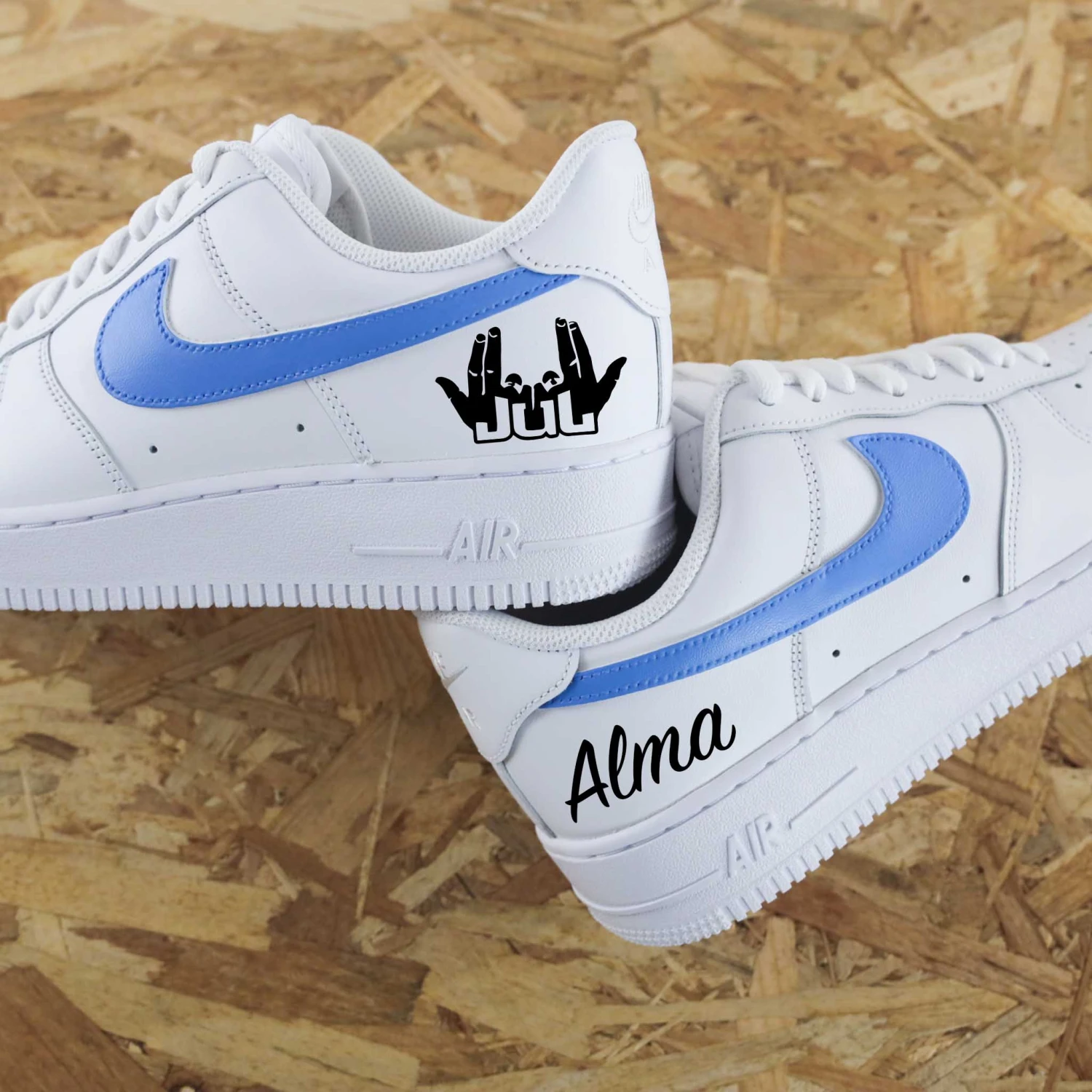 Baskets Nike Air Force 1 custom – Jul et inscription prénom sur les côtés extérieurs. Les 4 signes nike sont peints en couleur.
