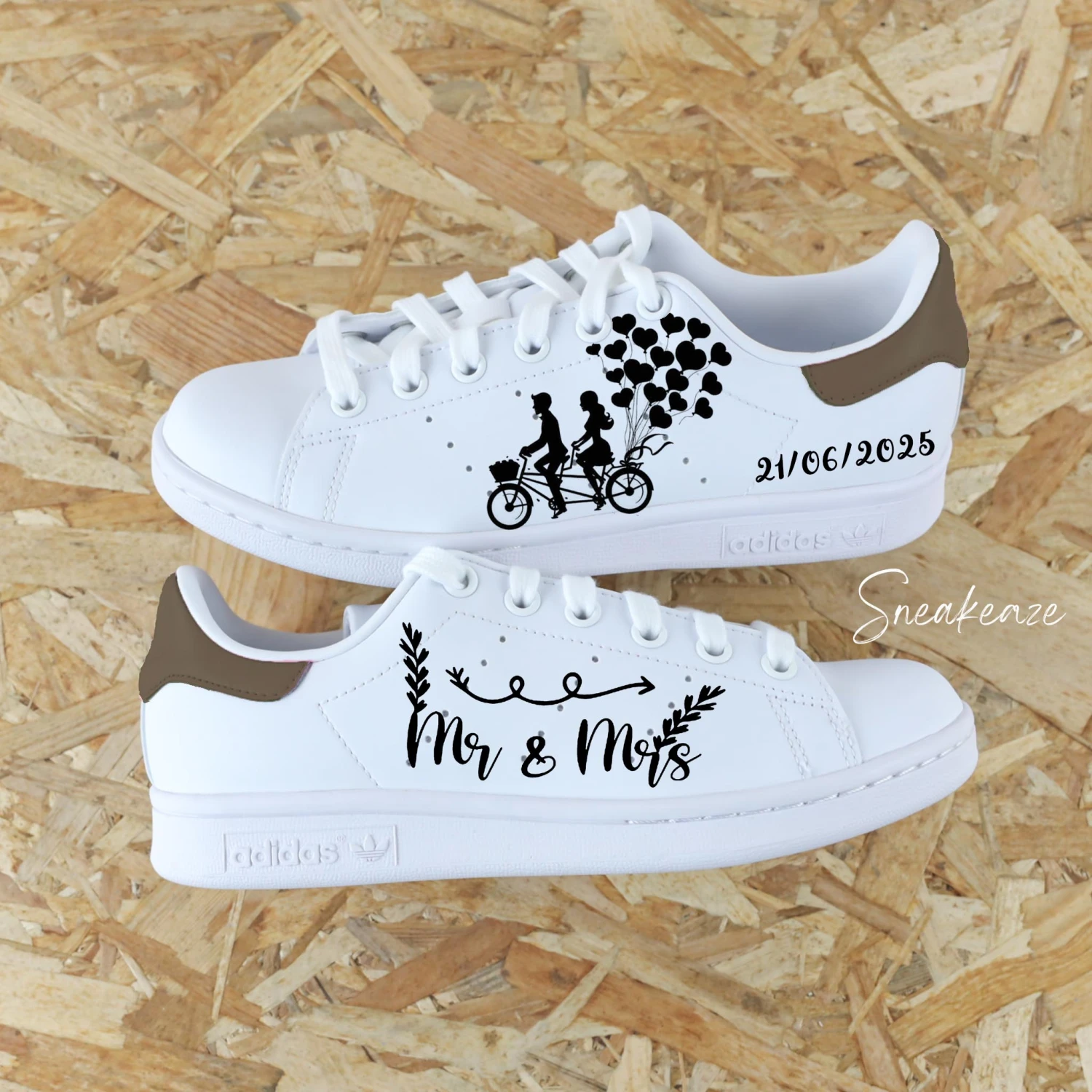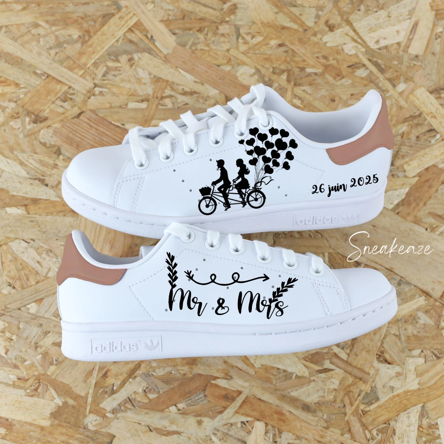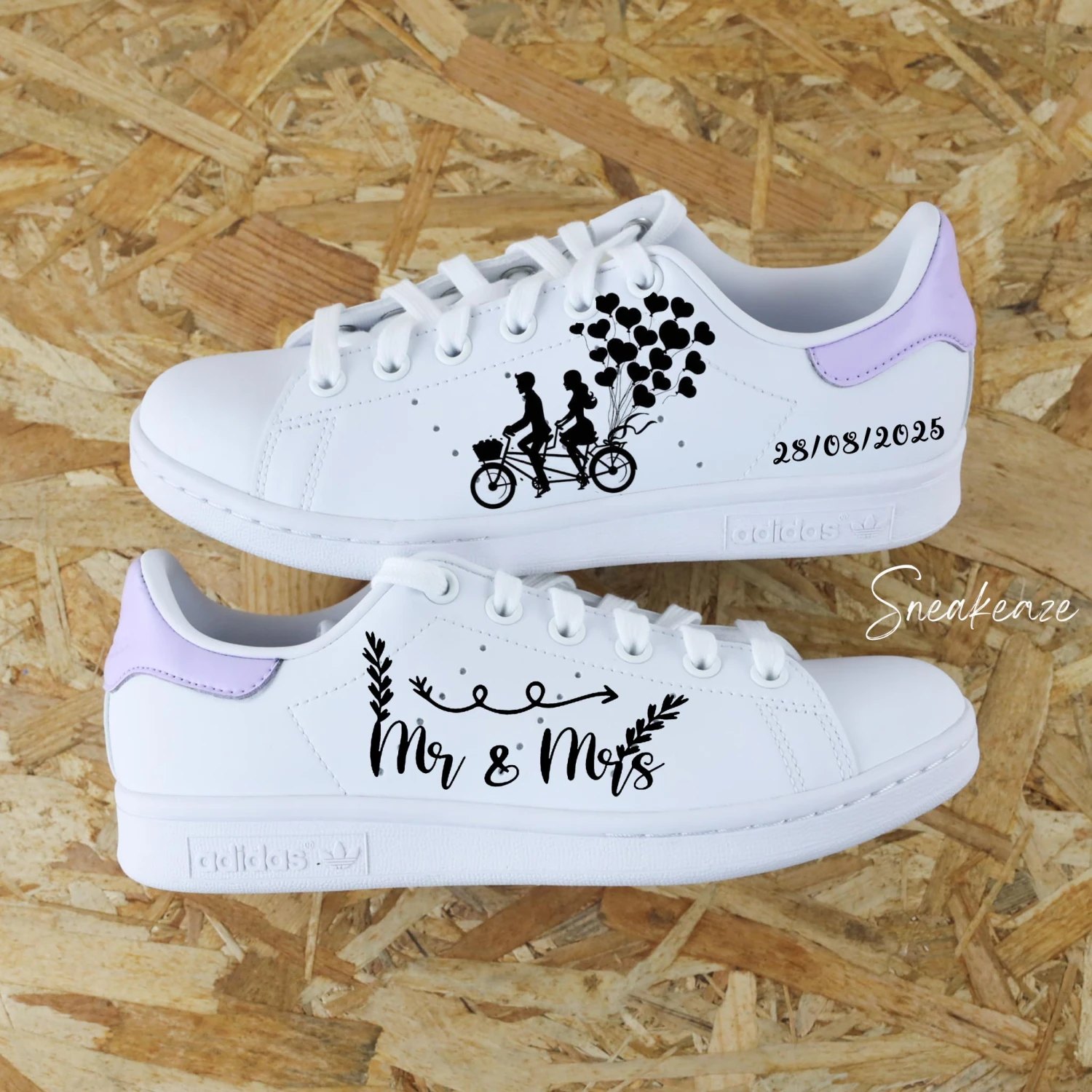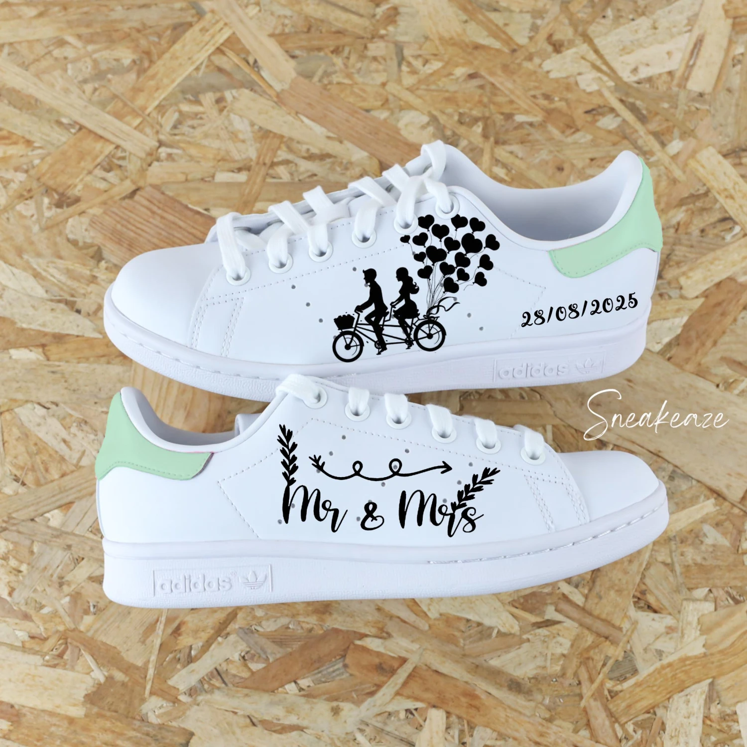 Baskets Adidas Stan smith custom – modèle mariage l’amour en vélo avec inscription de la date et de “mr & mrs”
