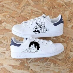 Baskets Adidas Stan Smith custom motifs Dragon Ball Z Goku ou Vegeta et splash sur côtés extérieurs. Le talon est peint en noir.