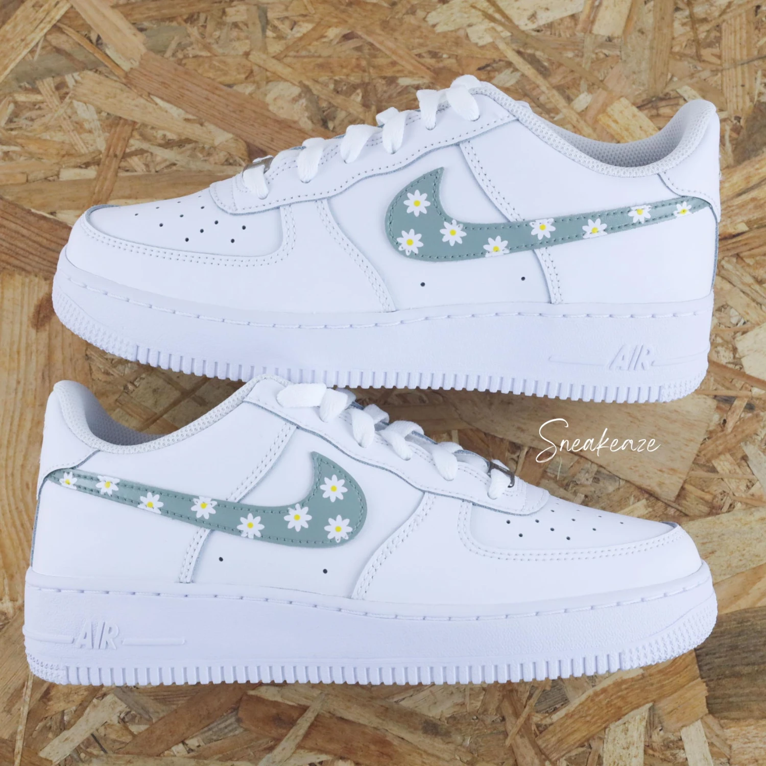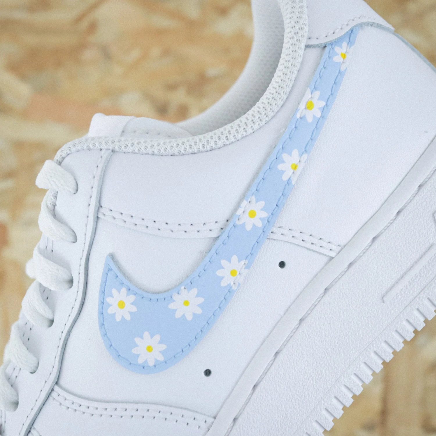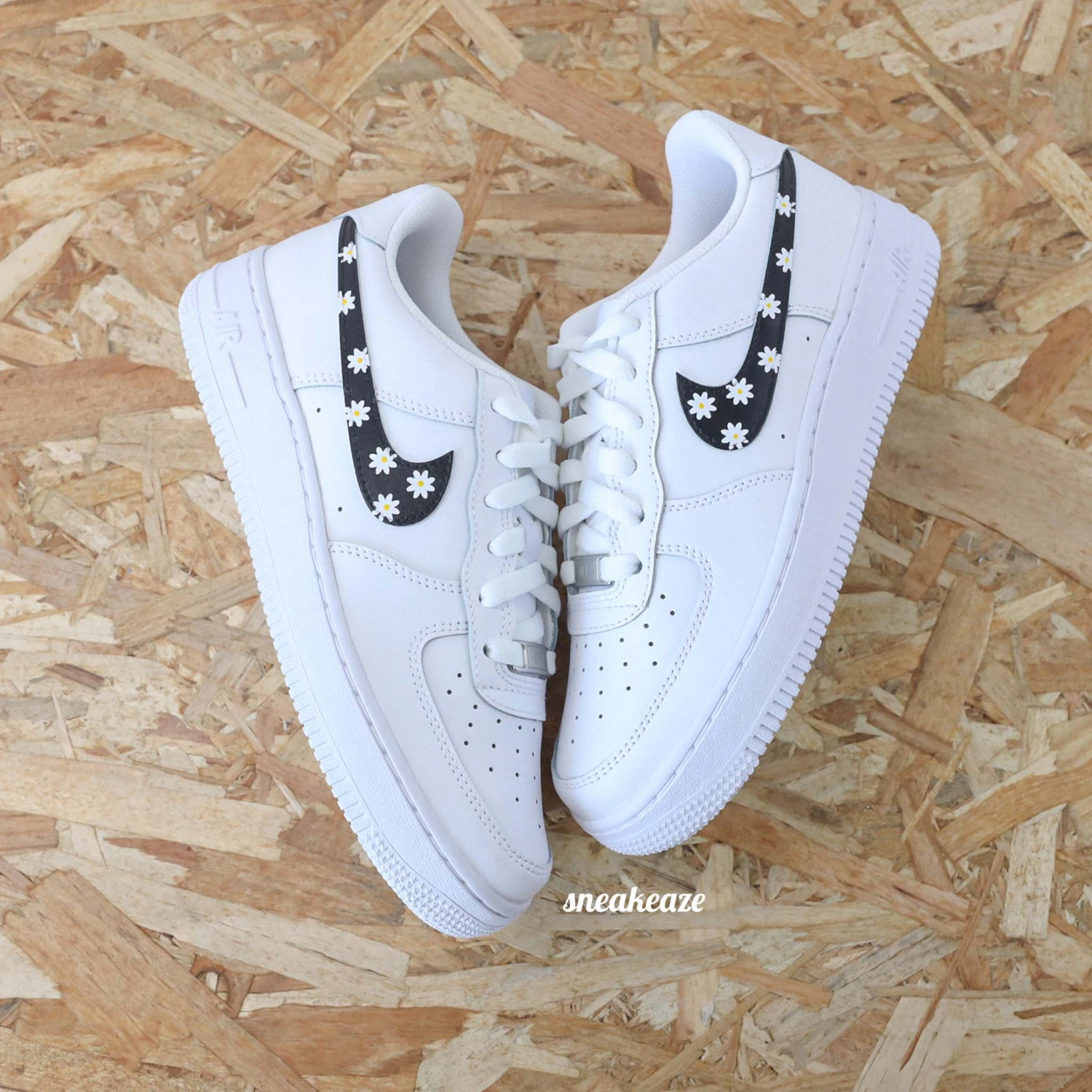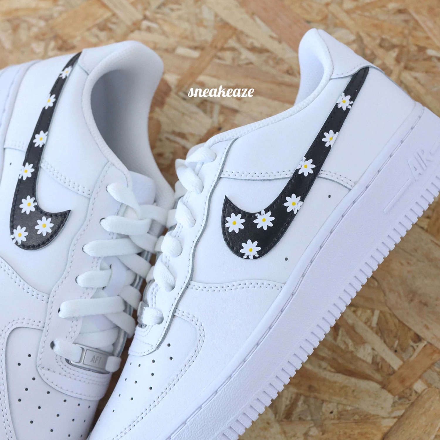 Baskets Nike Air force 1 custom motifs marguerite sur côtés intérieurs et extérieurs. Je souhaite ajouter un prénom à mon custom