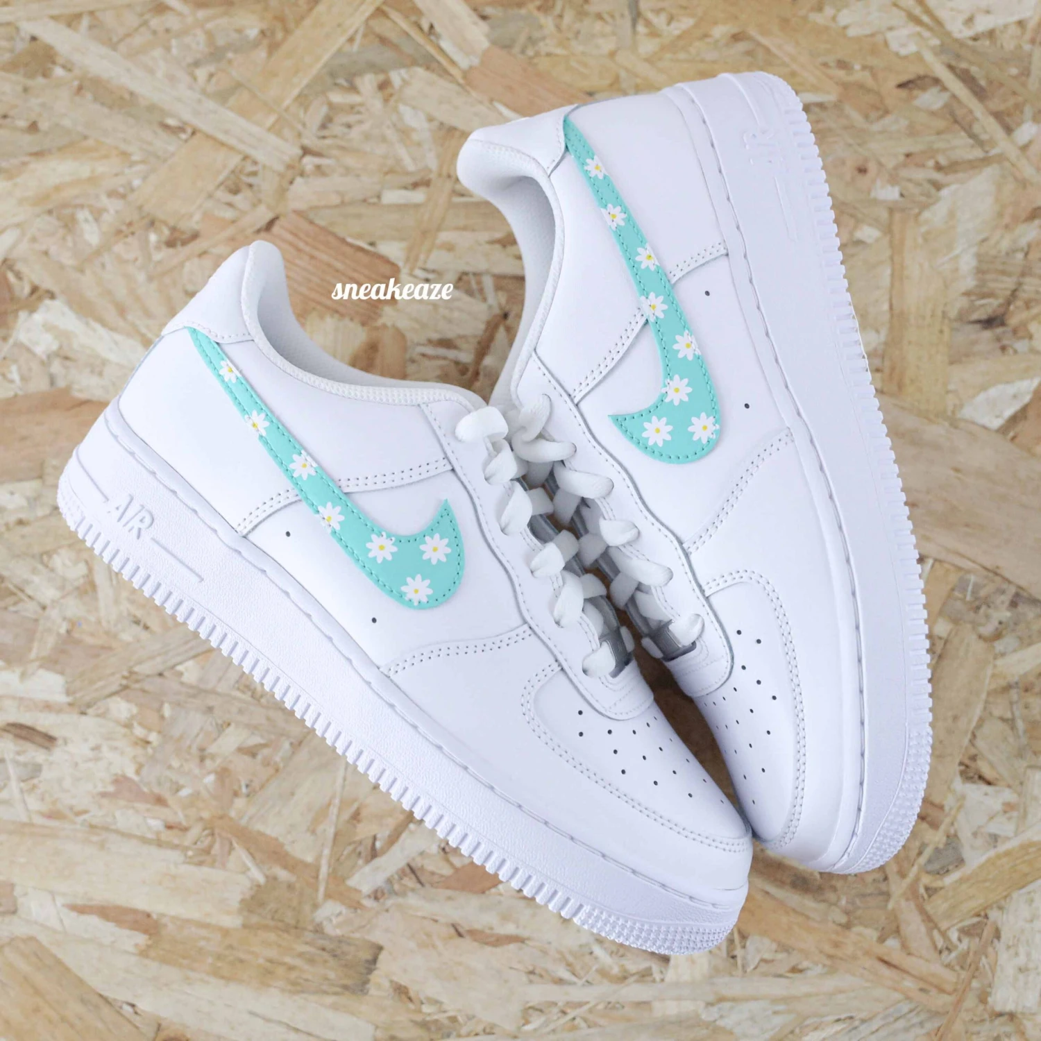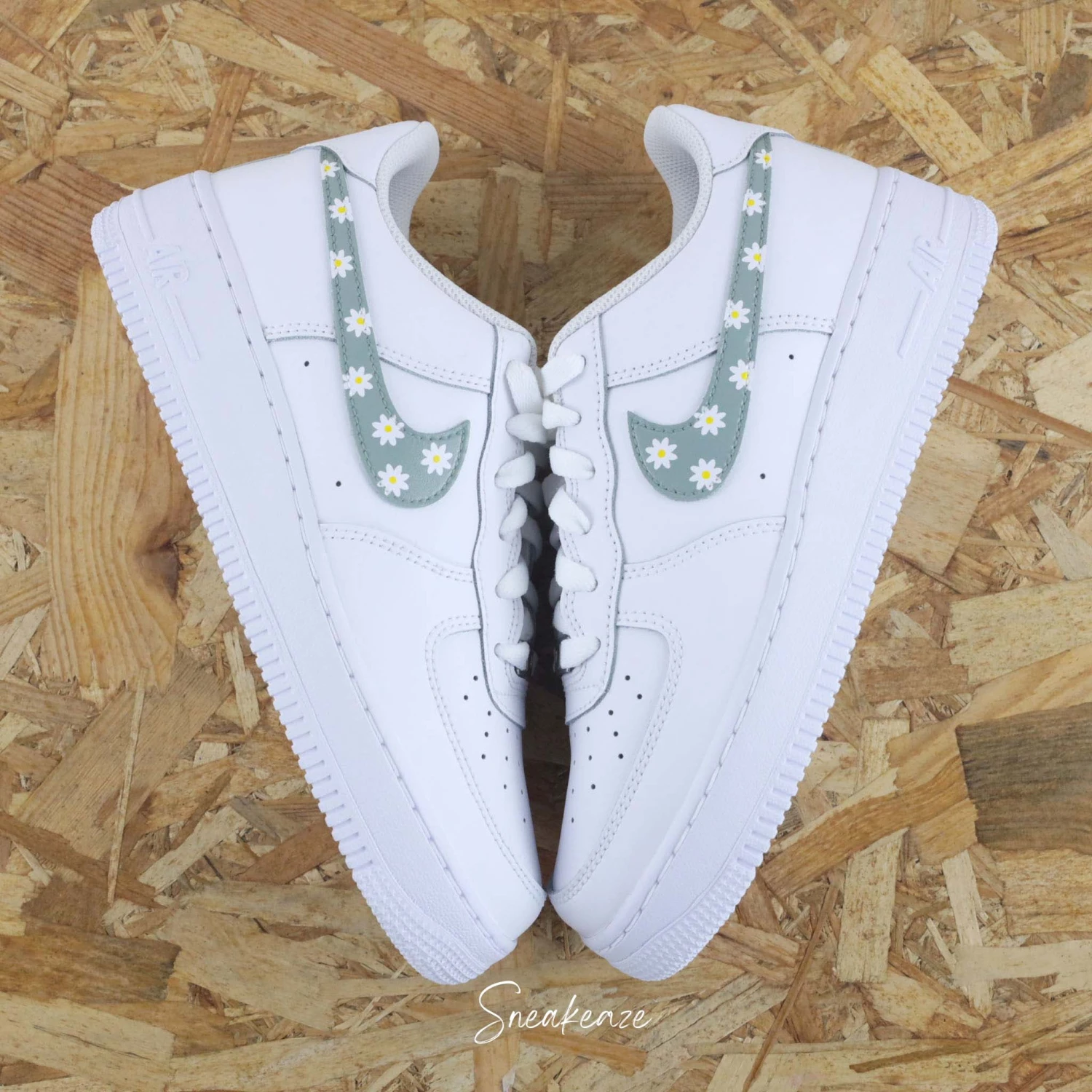 Baskets Nike Air force 1 custom motifs marguerite sur côtés intérieurs et extérieurs. Je souhaite ajouter un prénom à mon custom