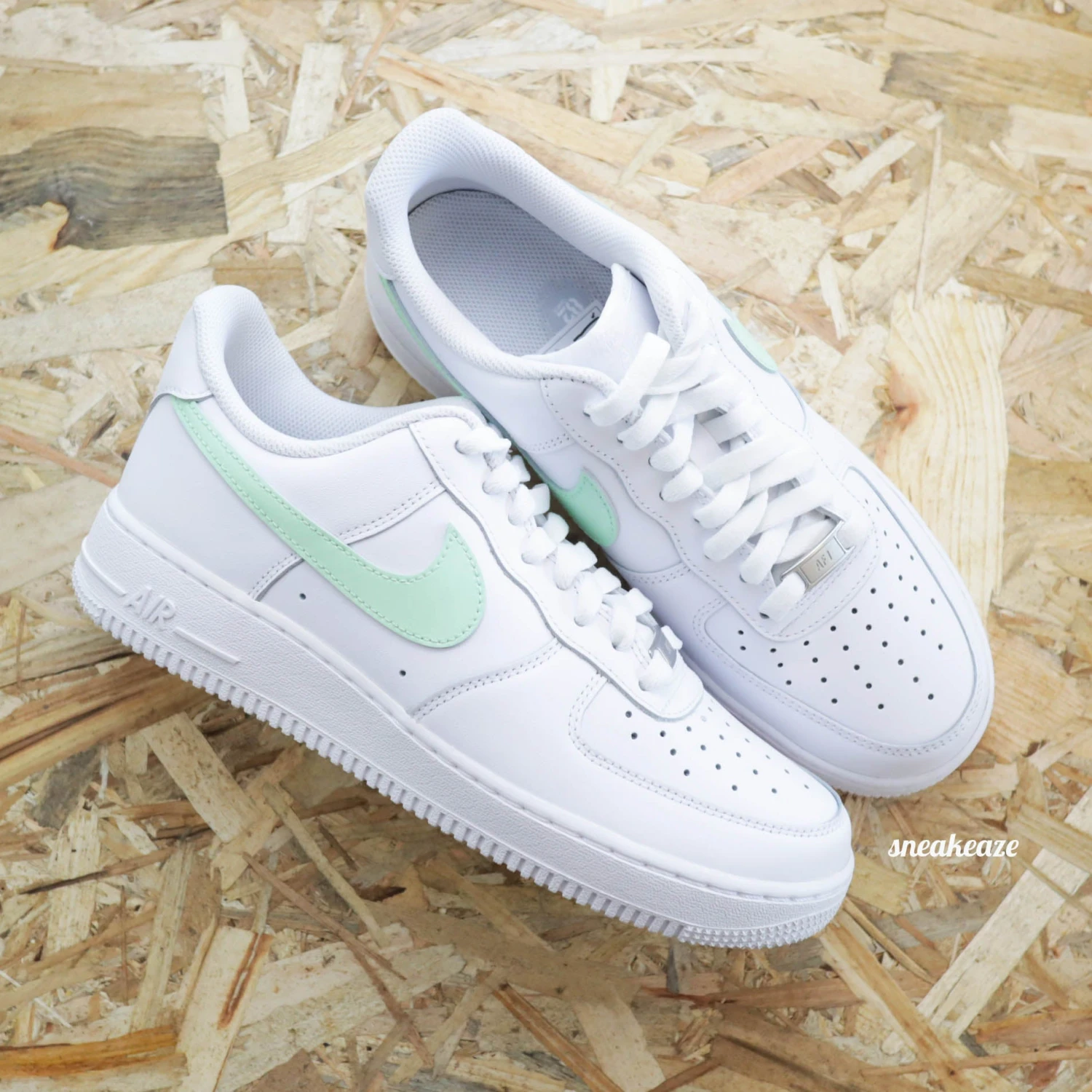 Baskets Nike Air force 1 custom les 4 signes Nikes sont de couleur menthe pastel. Je souhaite ajouter un prénom à mon custom
