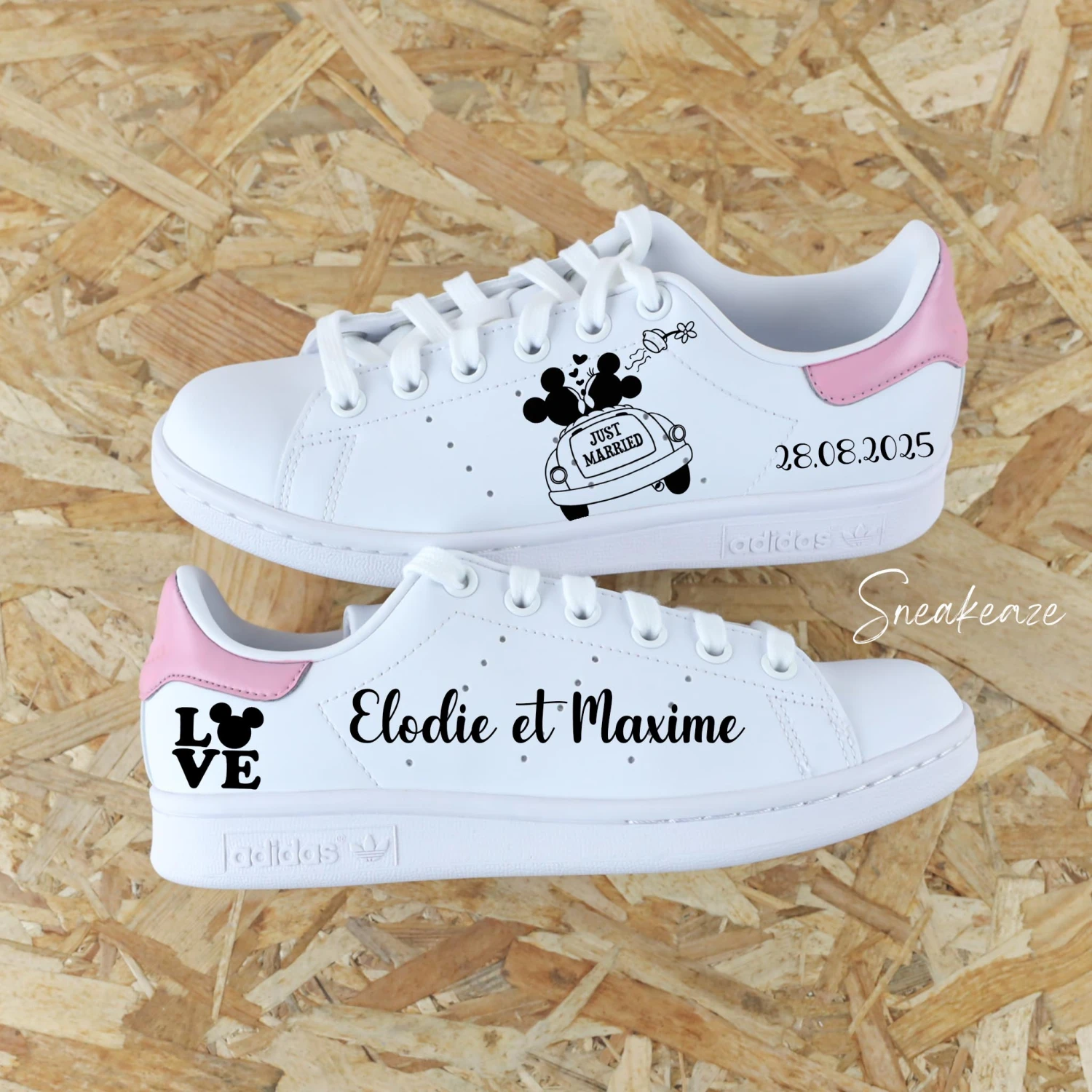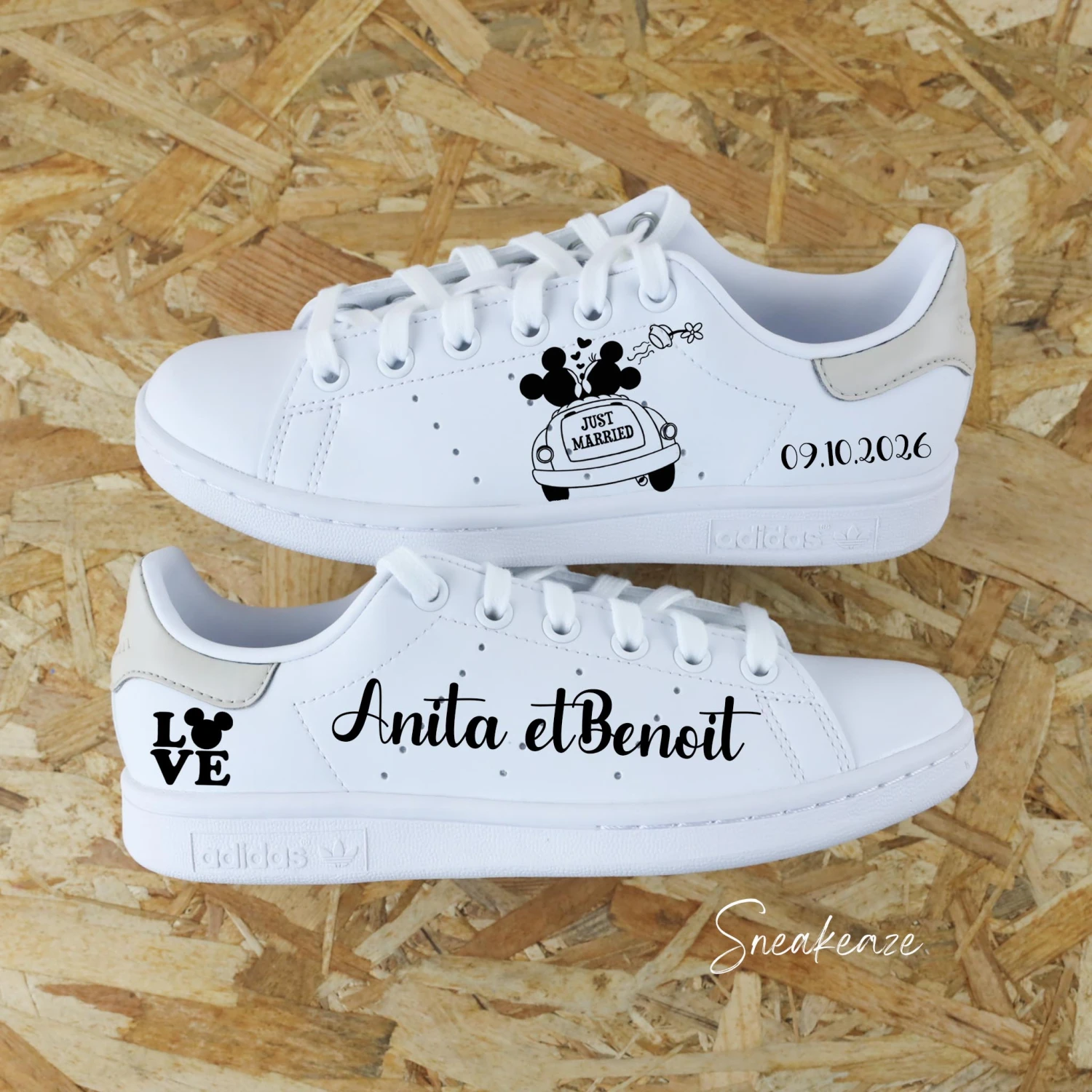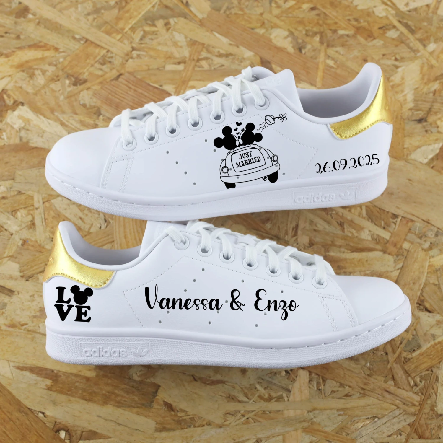 Adidas Stan smith custom pour mariage thème Disney. Dessins de Mickey et Minnie – inscription de la date et des prénoms des mariés. Talon peint à la main.