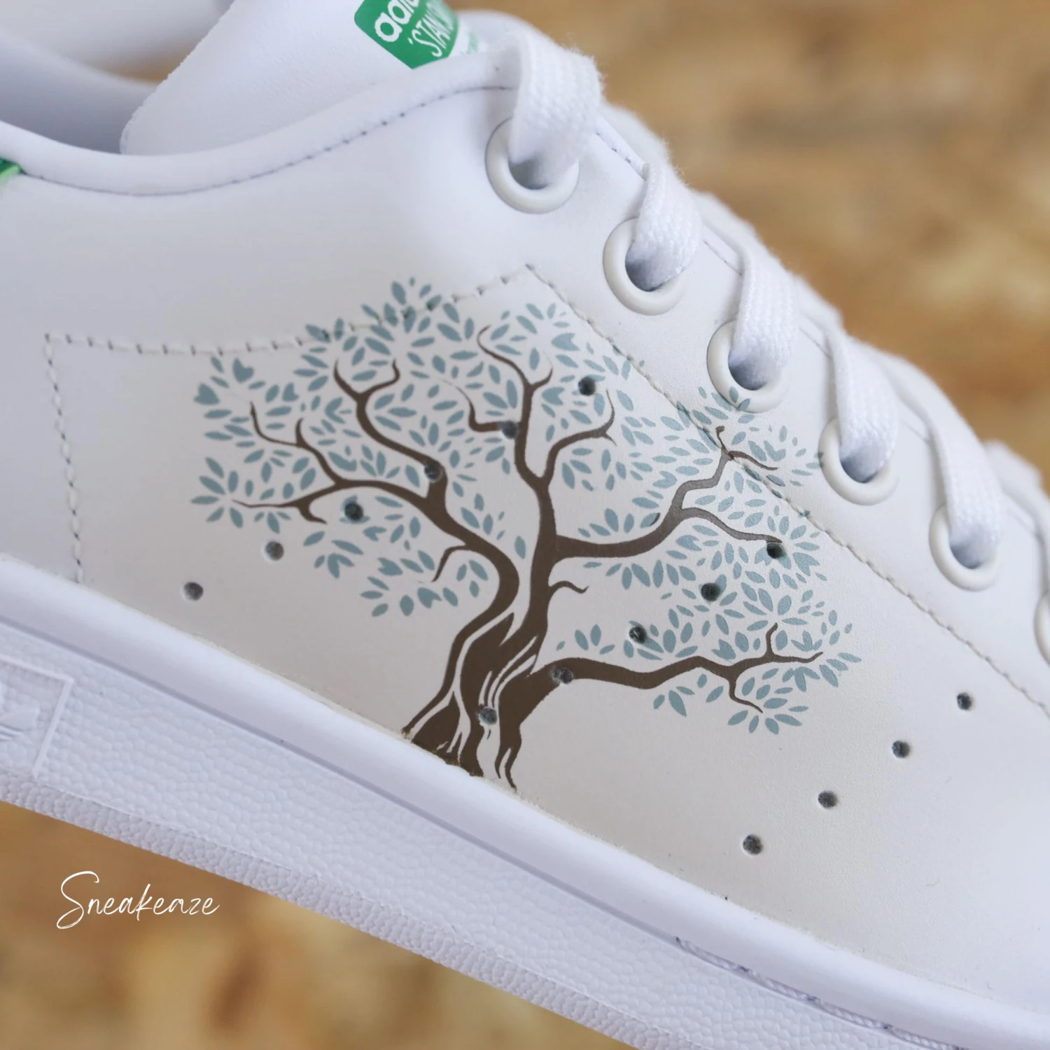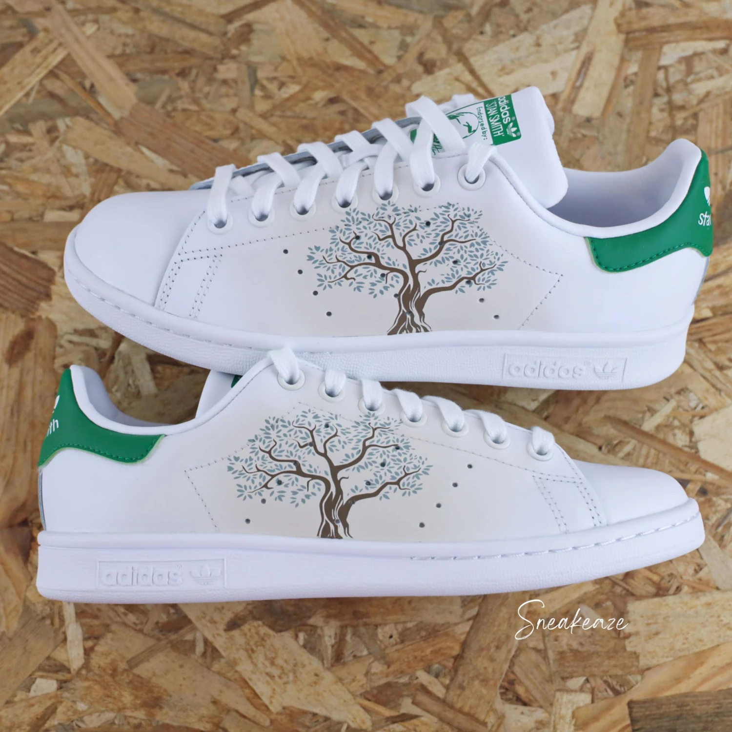 Baskets Adidas Stan Smith custom avec dessin d’un arbre de vie – olivier peint à la main sur les côtés extérieurs sur un fondu beige. Une paire toute en douceur et pleine de nature.