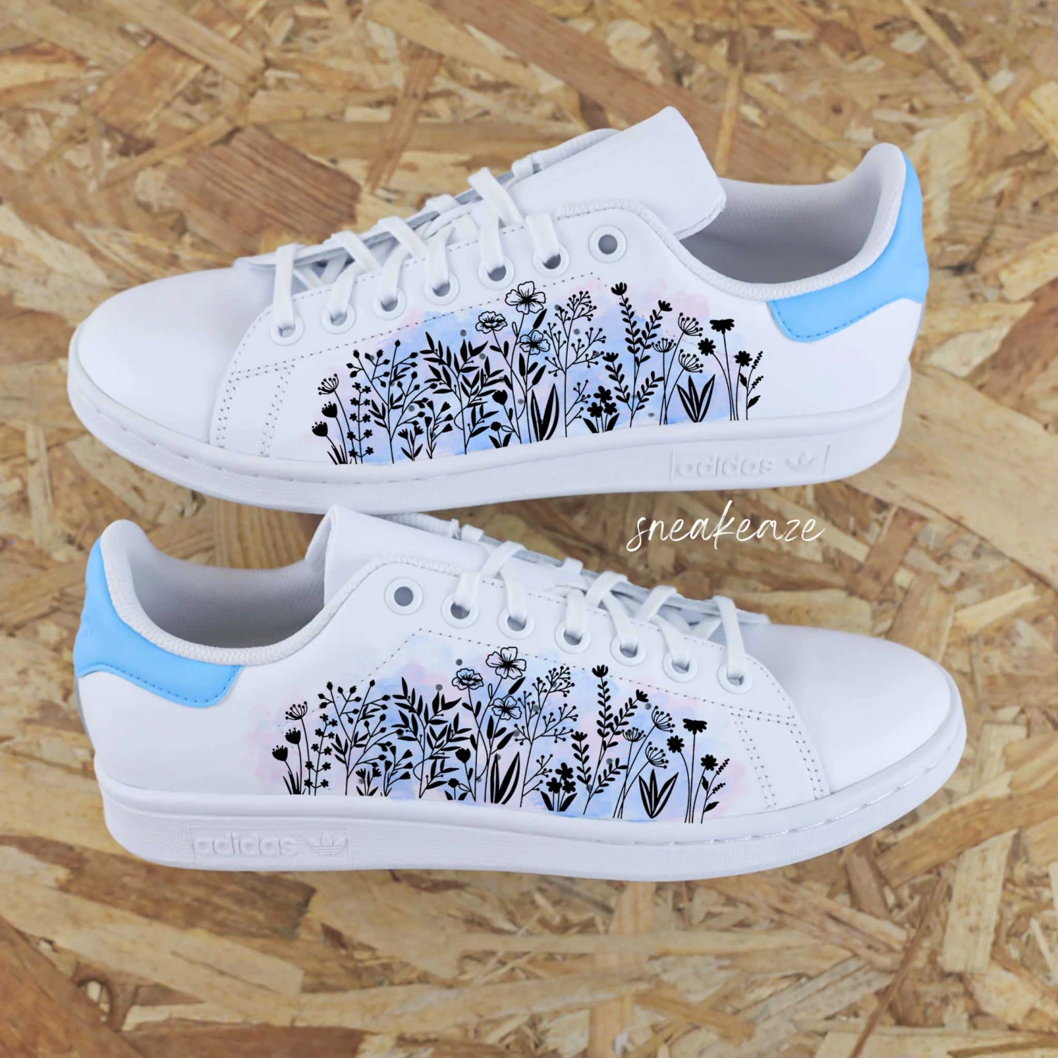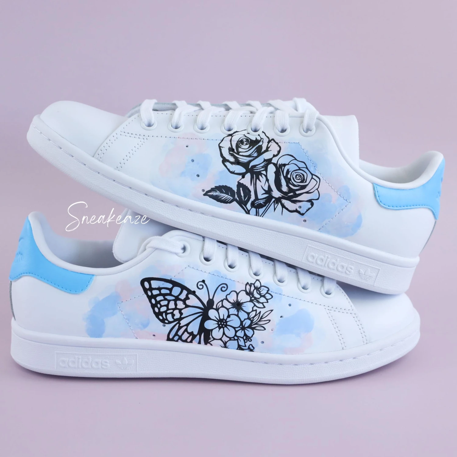Baskets Adidas Stan Smith custom dessin fleurs et papillons et effet aquarelle