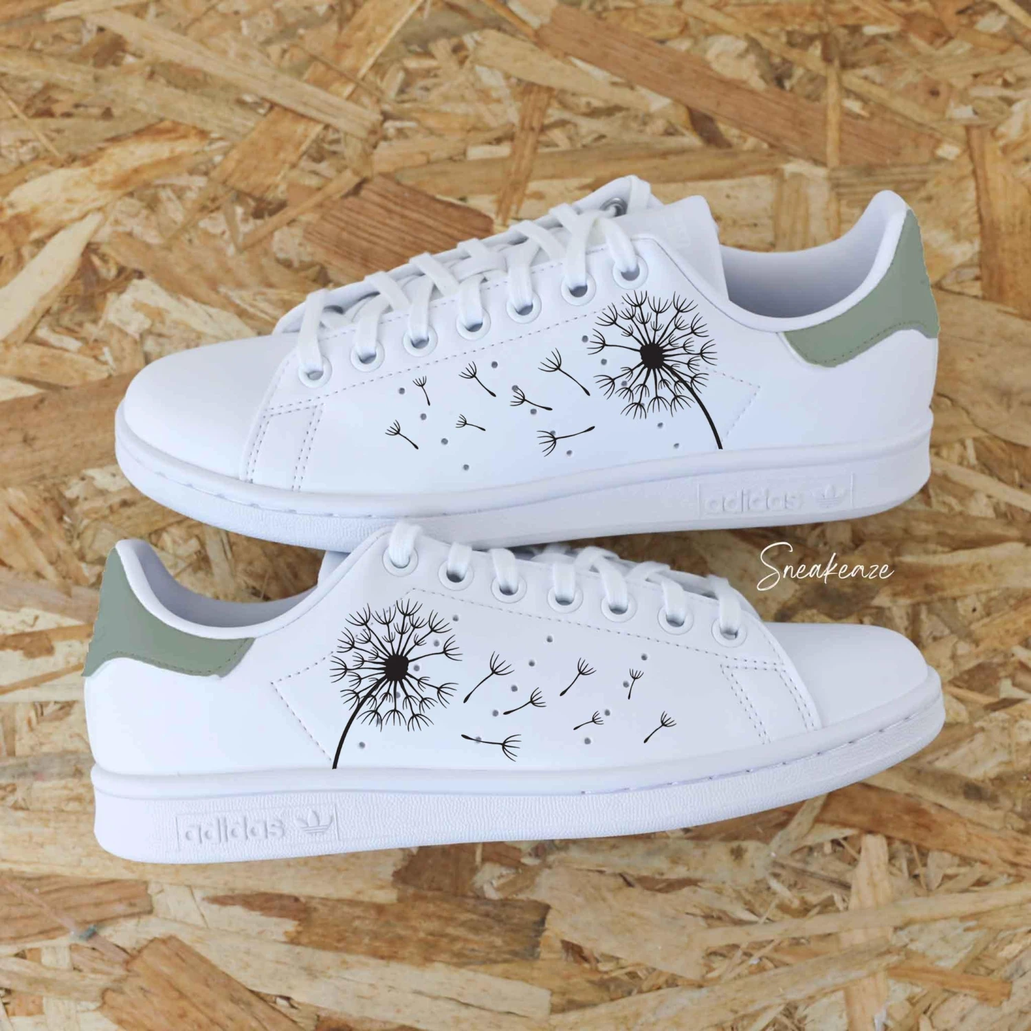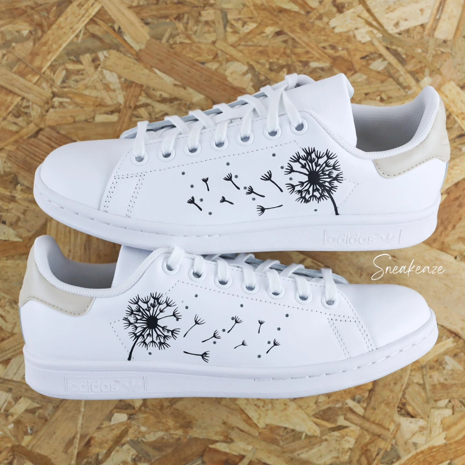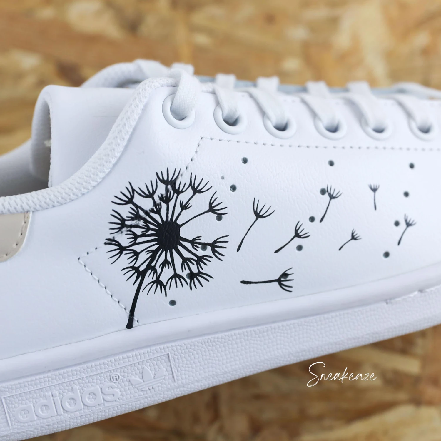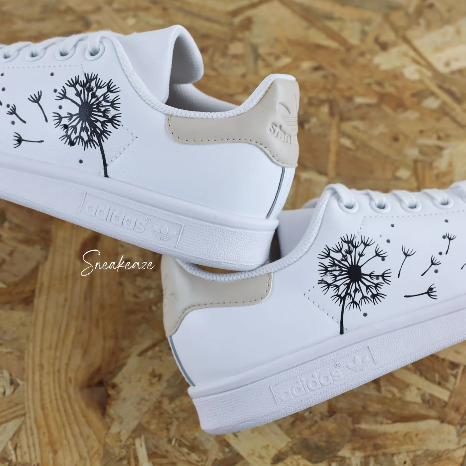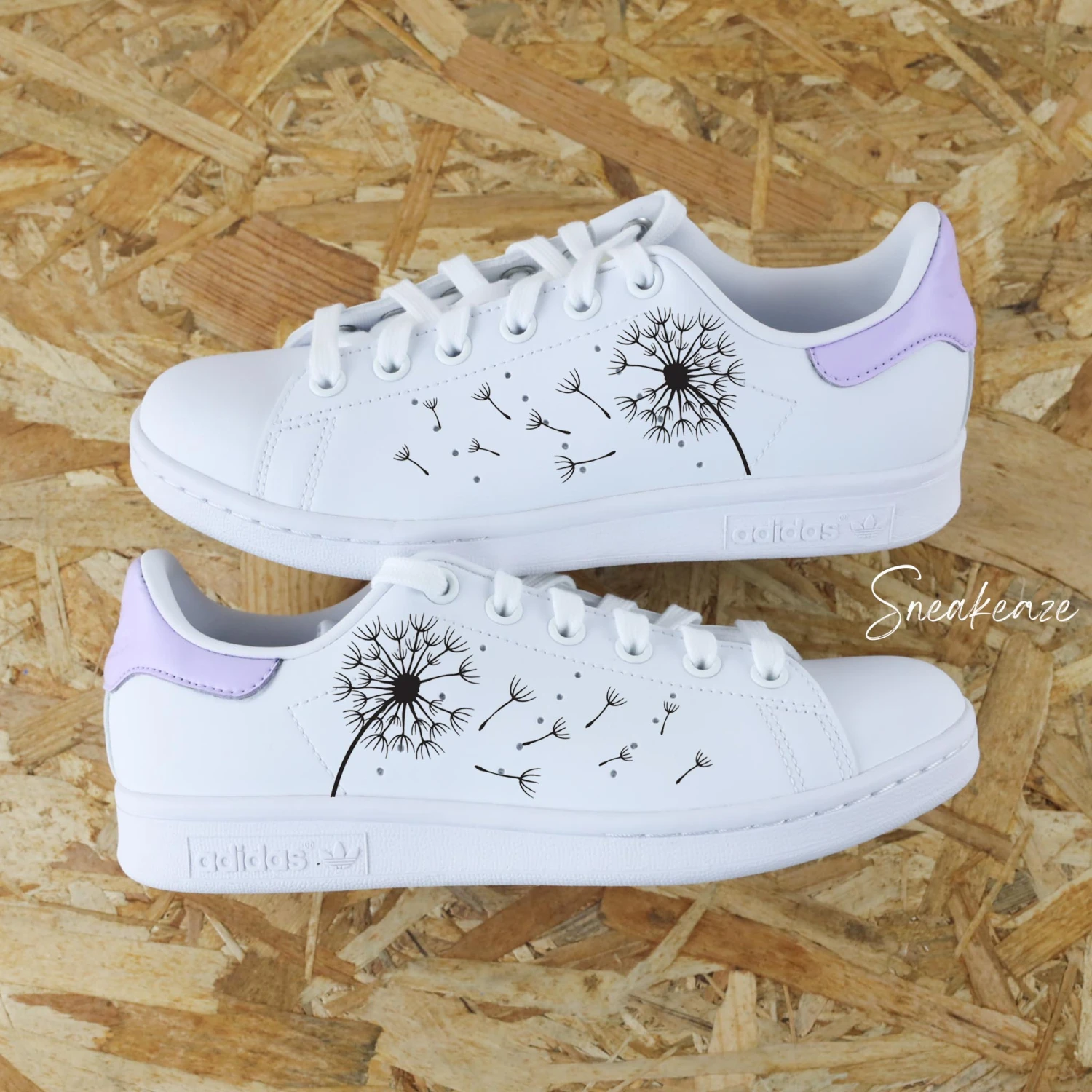 Baskets Adidas Stan Smith custom dessin fleurs pissenlit et talon peint à la main.