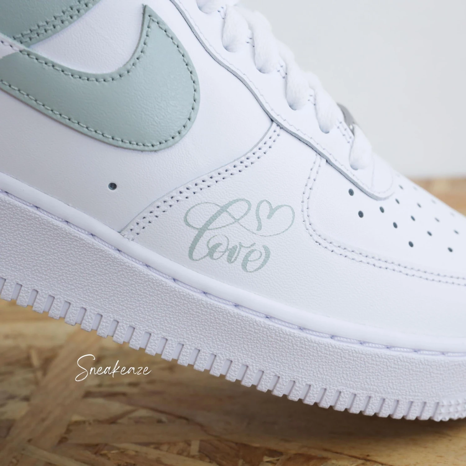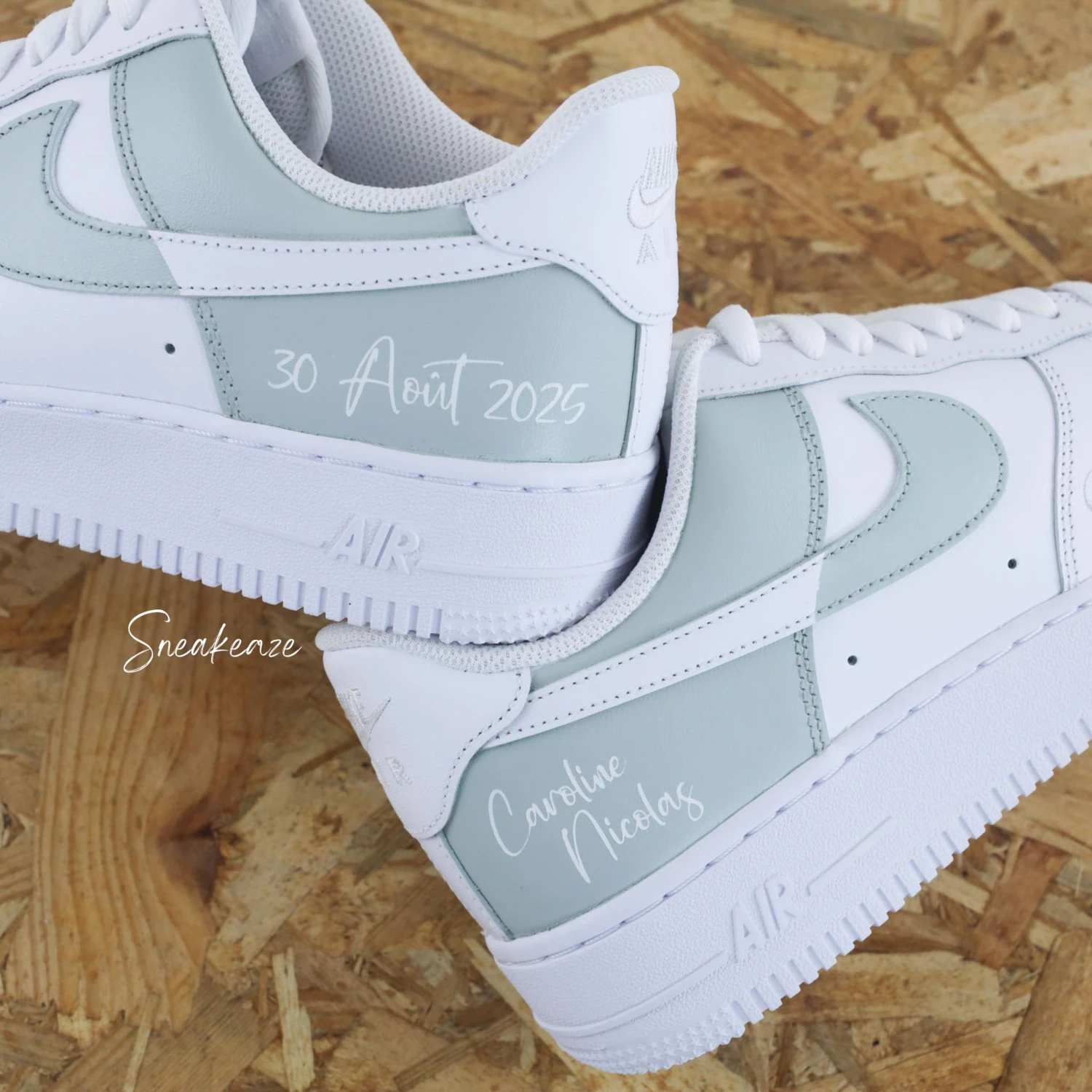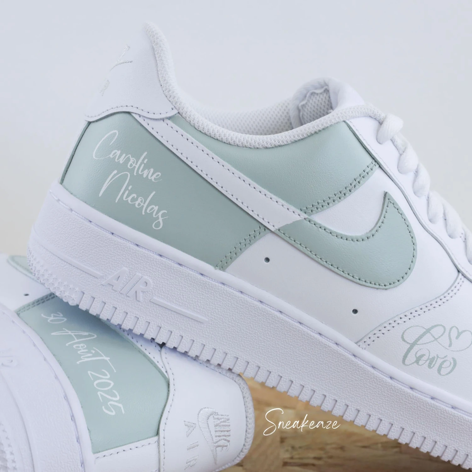 Basket Nike air force 1 custom modèle reverse couleur vert de gris. Inscription des prénoms et de la date de mariage