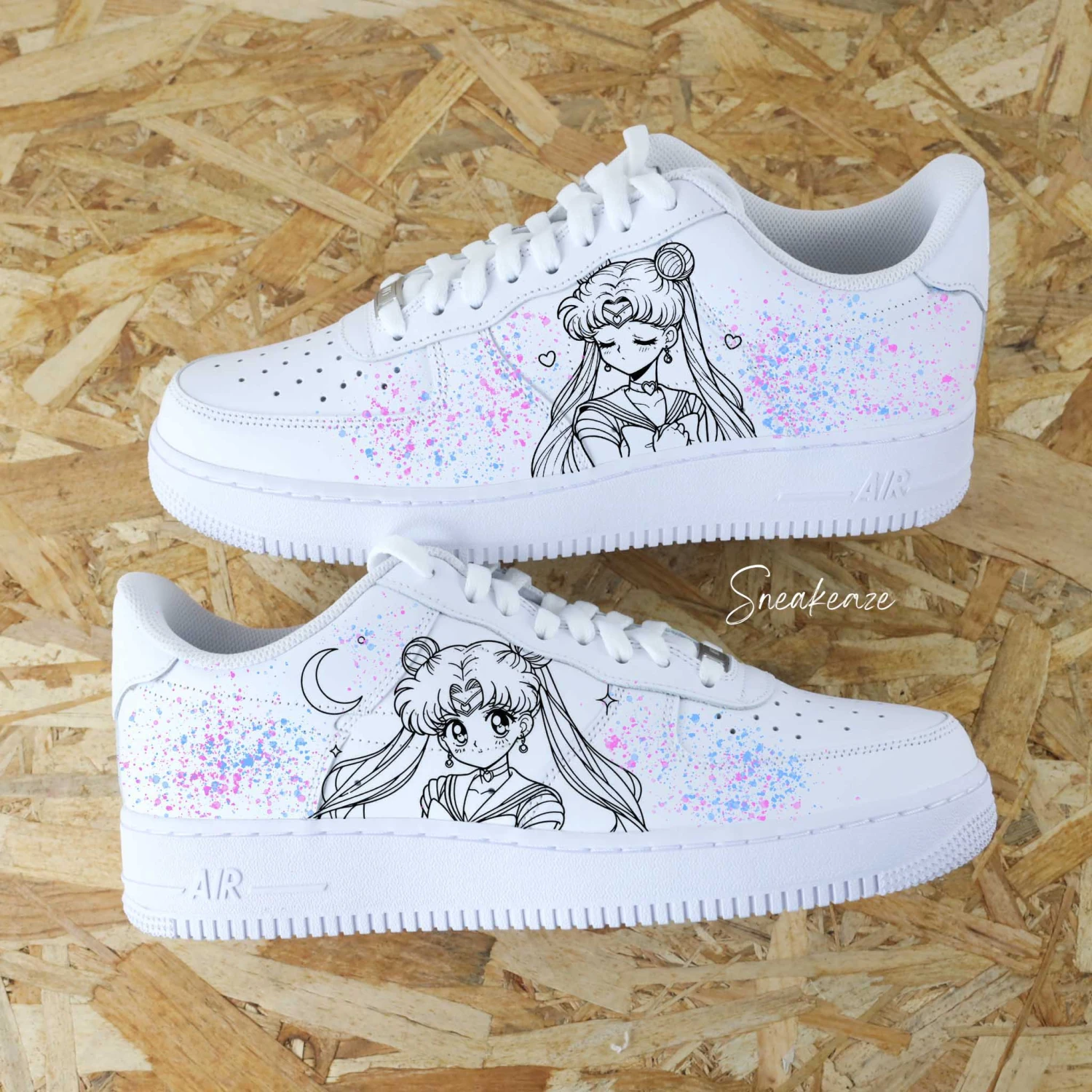 Baskets Nike Air force 1 custom – Sailor Moon. Dessin Sailor Moon avec splash bleu et rose sur les côtés extérieurs.