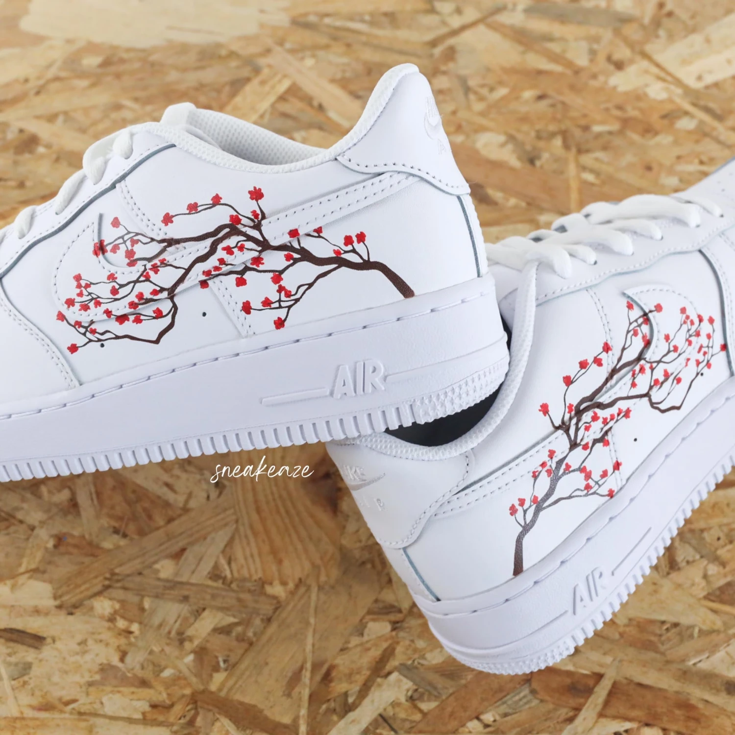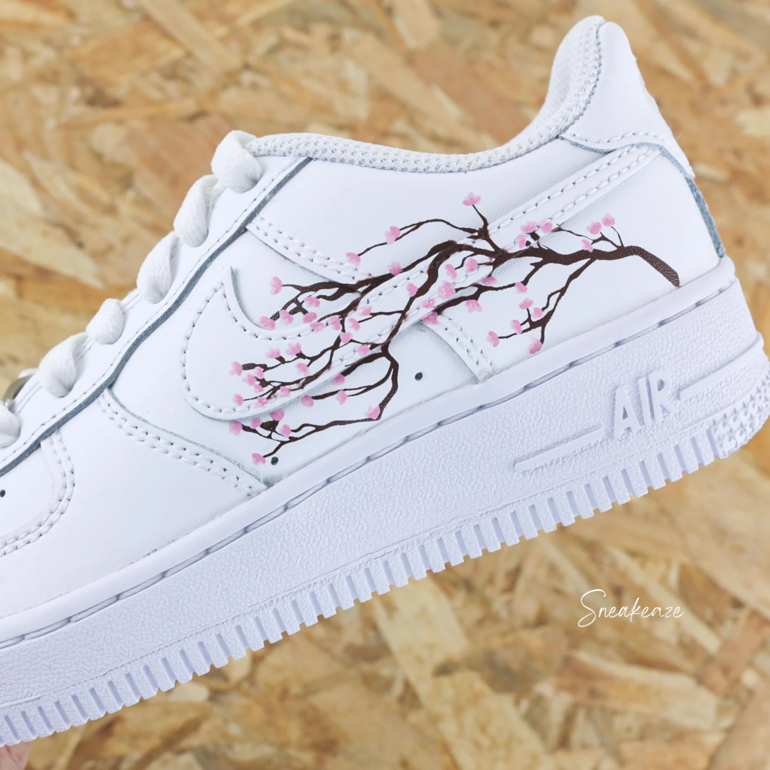 Baskets Air Force 1 custom blanches avec dessins peint à la main de fleurs de sakura cherry blossom sur les côtés extérieurs. Le tarif comprend la paire ainsi que la customisation.