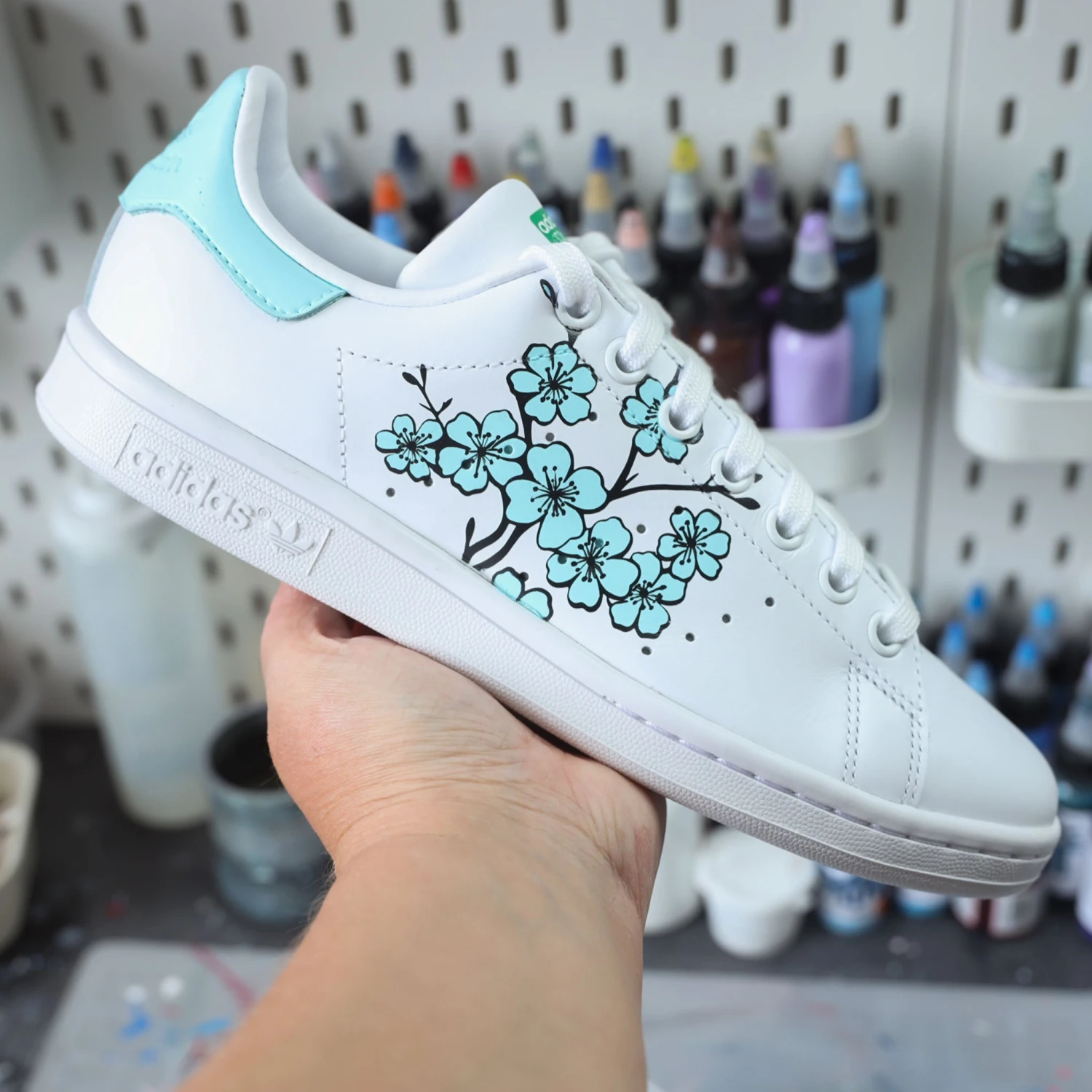 Baskets Adidas Stan Smith custom avec dessin de fleurs de sakura cherry blossom bleu aqua peint à la main sur les côtés extérieurs ainsi que le talon.