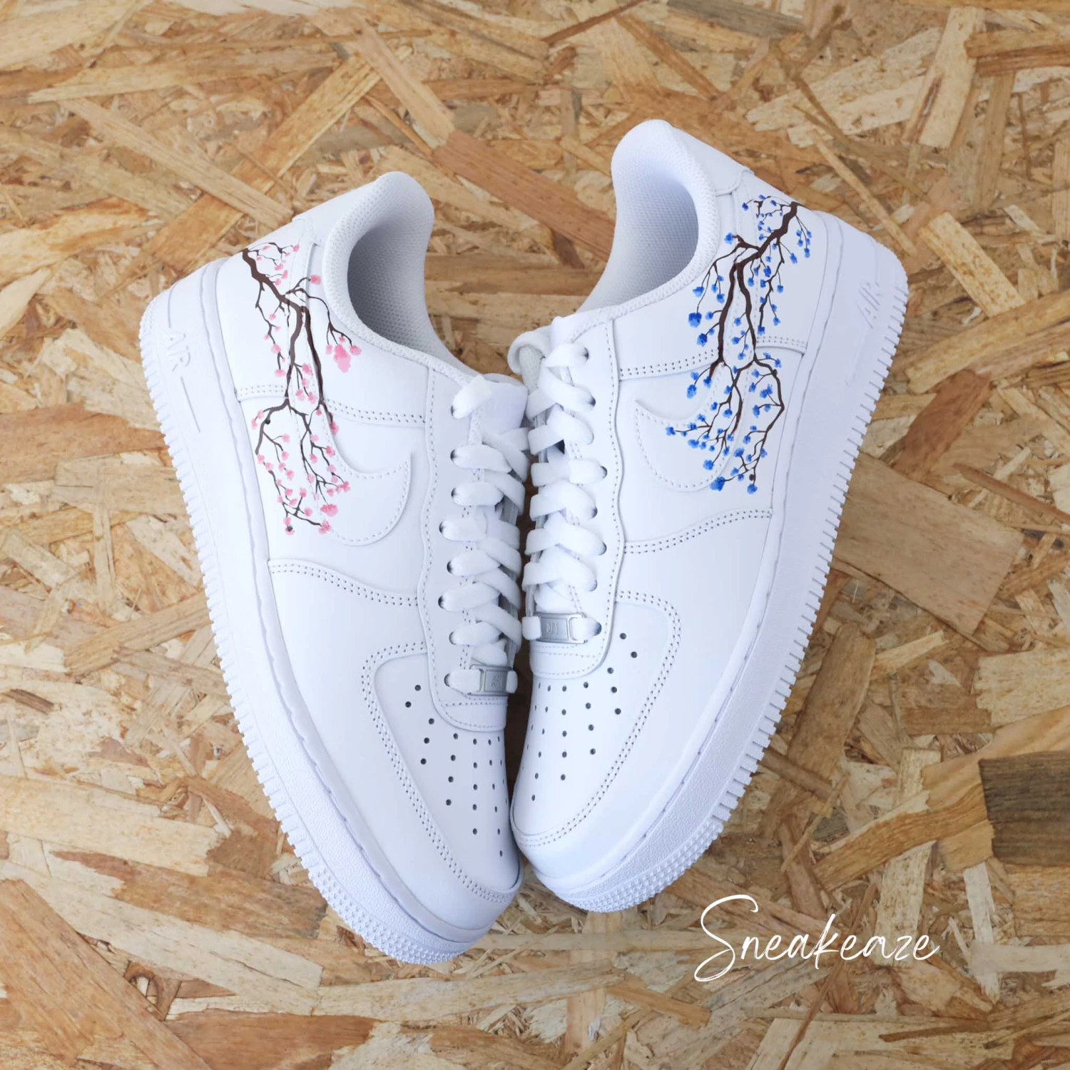 Baskets Air Force 1 custom blanches avec motif cherry blossom couleur mix peint à la main, le tout sur les côtés extérieurs uniquement. Le tarif comprend la paire ainsi que la customisation.