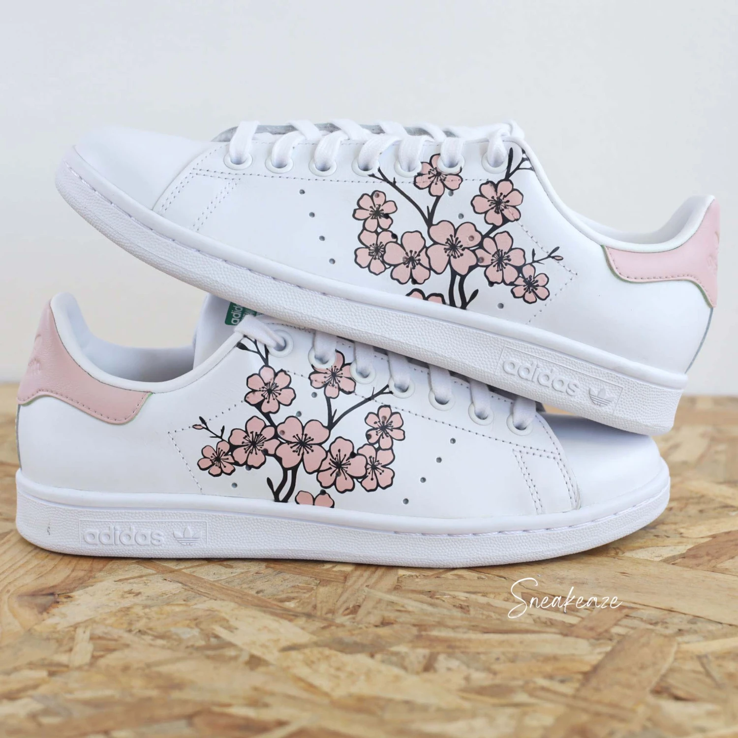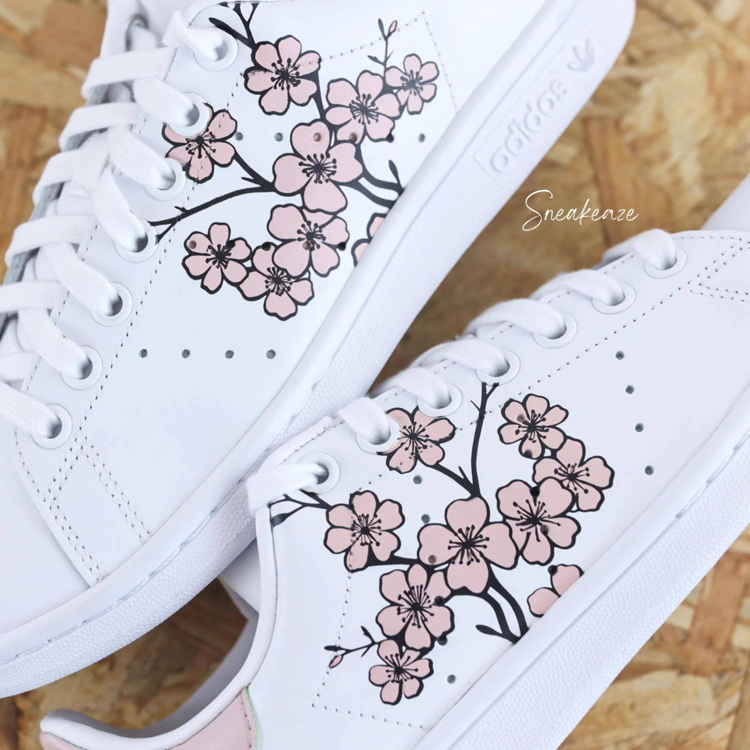 Baskets Adidas Stan Smith custom avec dessin de fleurs de sakura cherry blossom rose peint à la main sur les côtés extérieurs ainsi que le talon.