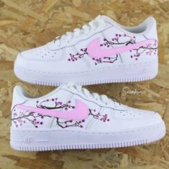 Baskets Air Force 1 custom blanches avec swoosh peint en baby pink pastel et dessin fleurs de cerisiers peint à la main sur les côtés extérieurs uniquement. Le tarif comprend la paire ainsi que la customisation.