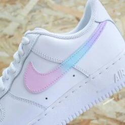 Baskets Nike Air Force 1 custom splash dégradé rouge et bleu au couleur de l’équipe américaine de football américain les Buffalo Bills.