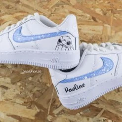 Baskets Nike Air force 1 custom – stitch. Dessins Stitch et inscription du prénom sur les côtés extérieurs. Signes Nike bleu avec splash.