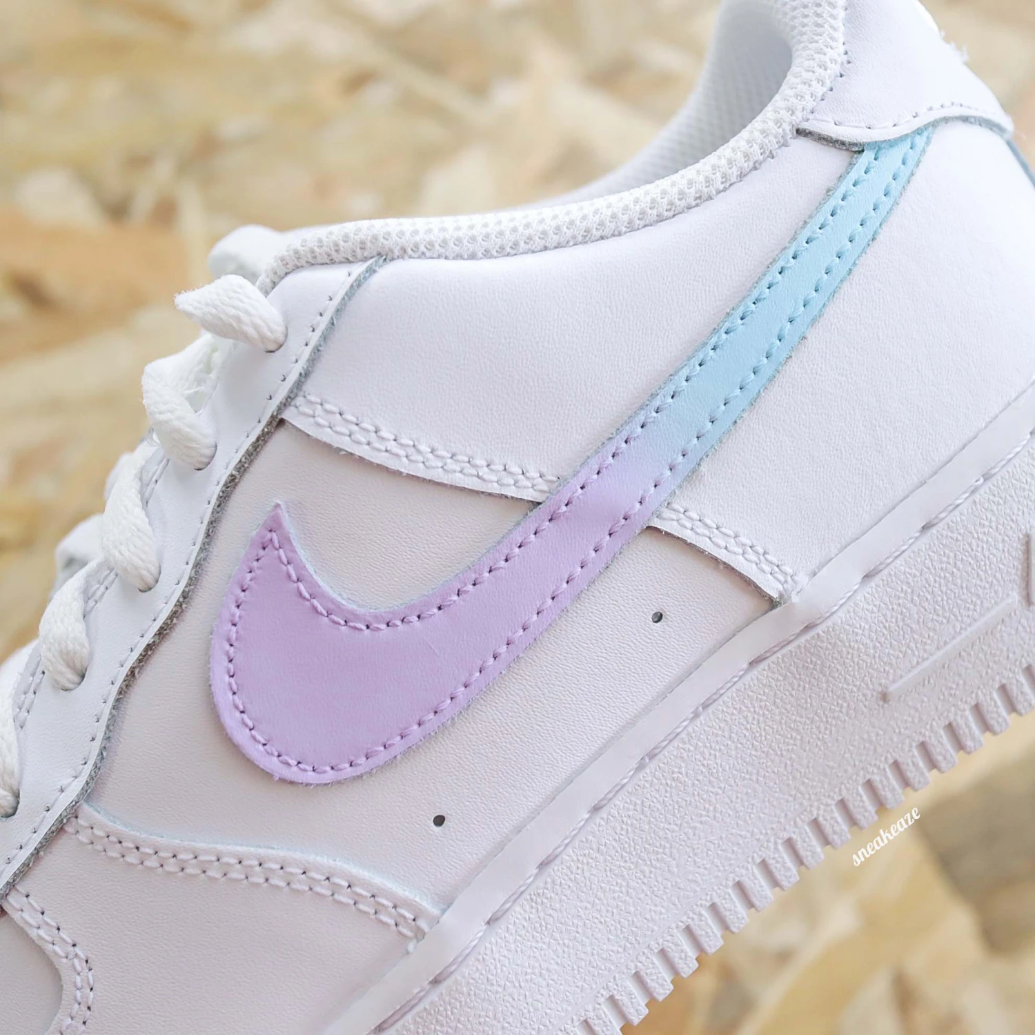 Baskets nike Air Force 1 custom swoosh dégradé baby blue et lila. Je souhaite ajouter un prénom à mon custom