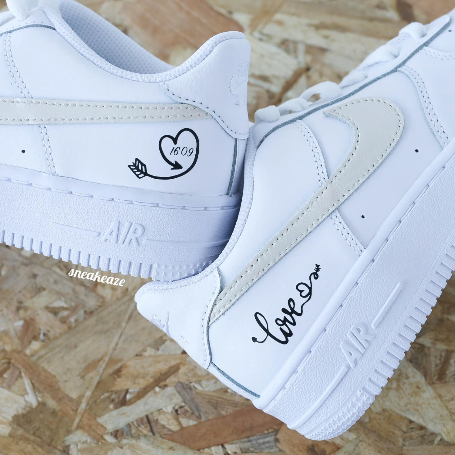 Nike Air Force 1 basses blanches en cuir, Démarquez-vous avec une paire de sneakers personnalisable avec votre date de mariage et les signes Nike beige clair qui sort vraiment de l’ordinaire pour le jour J. Je dis OUI !